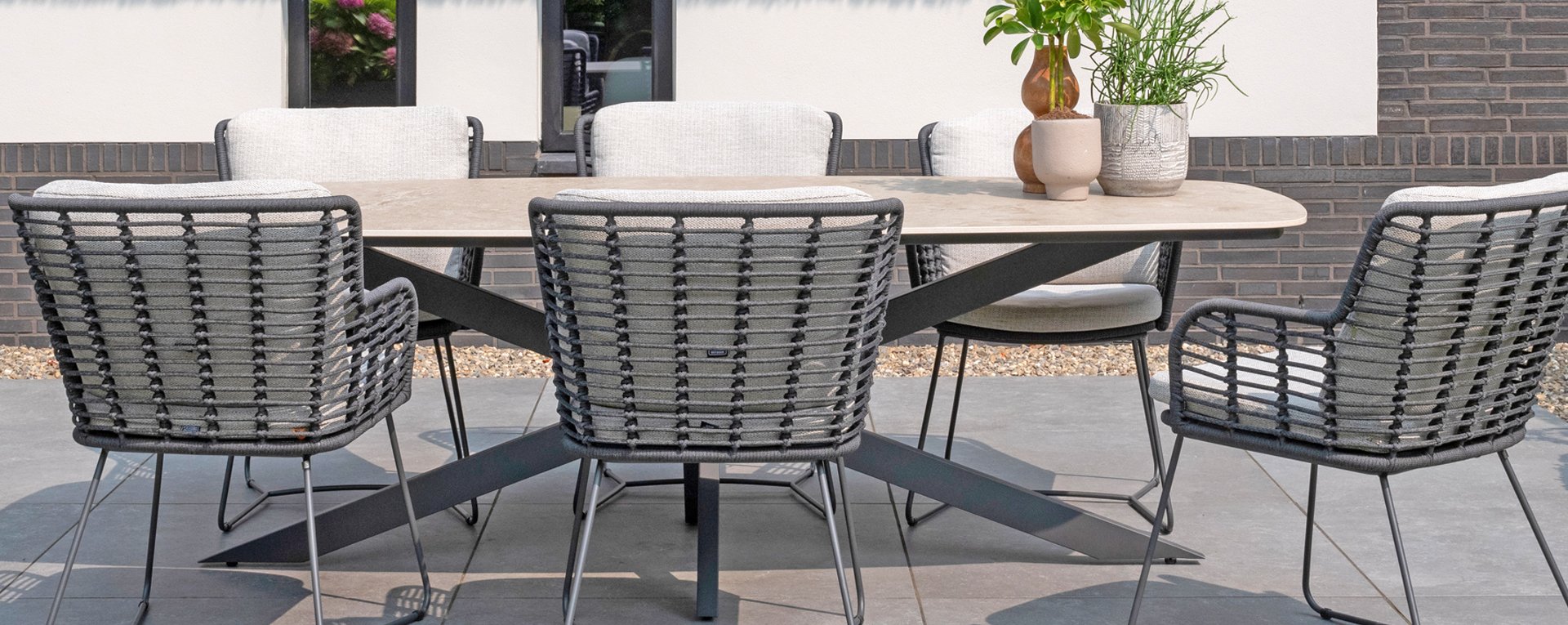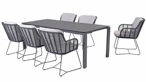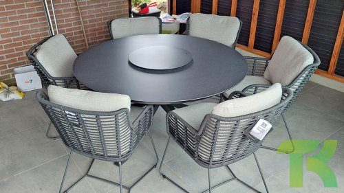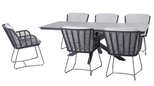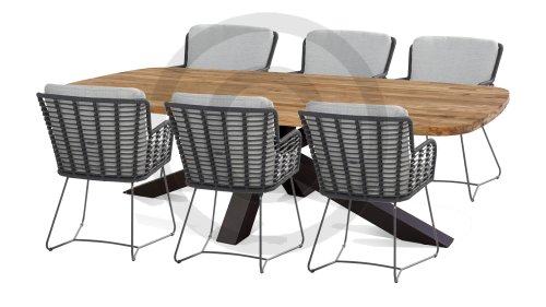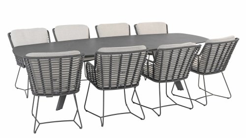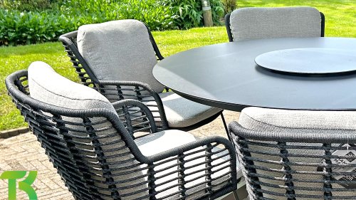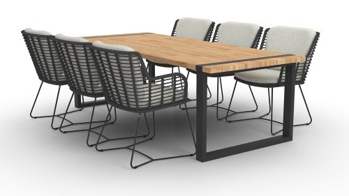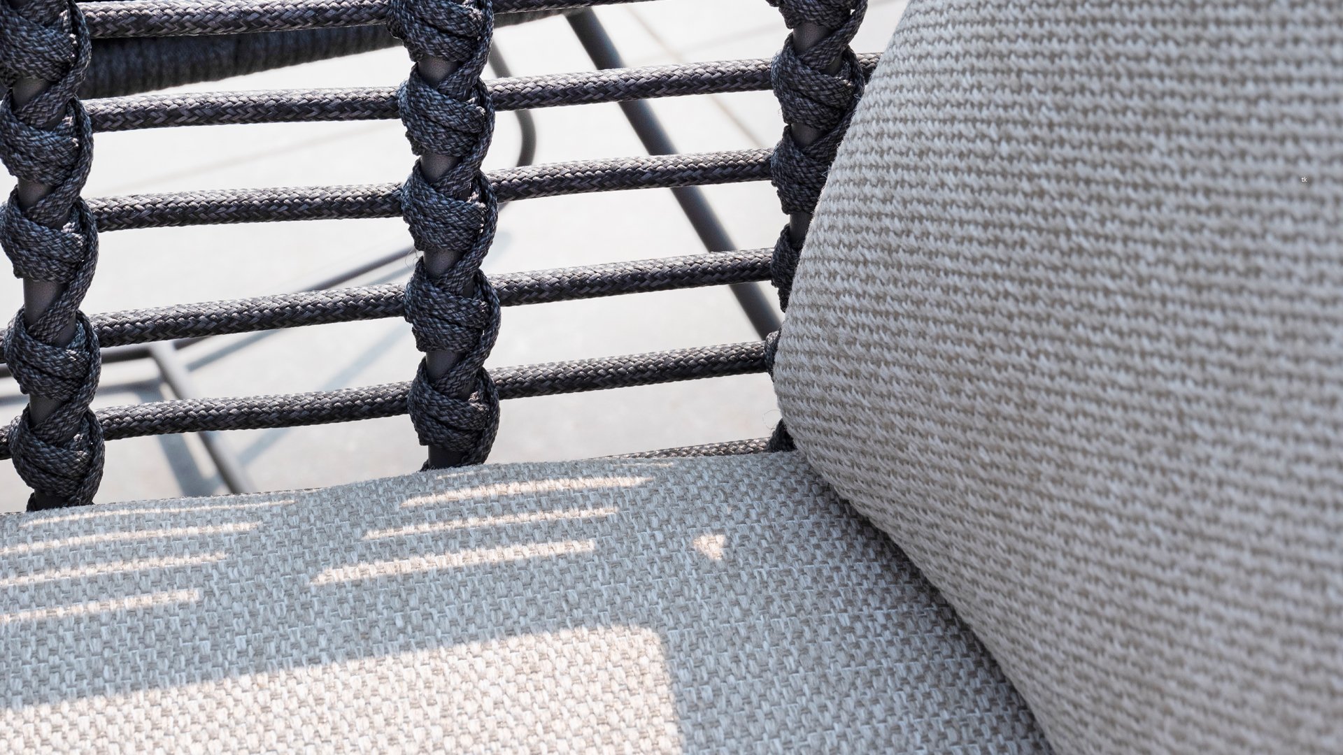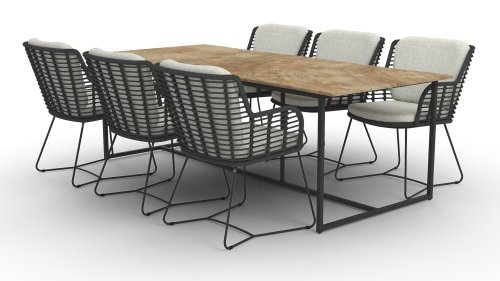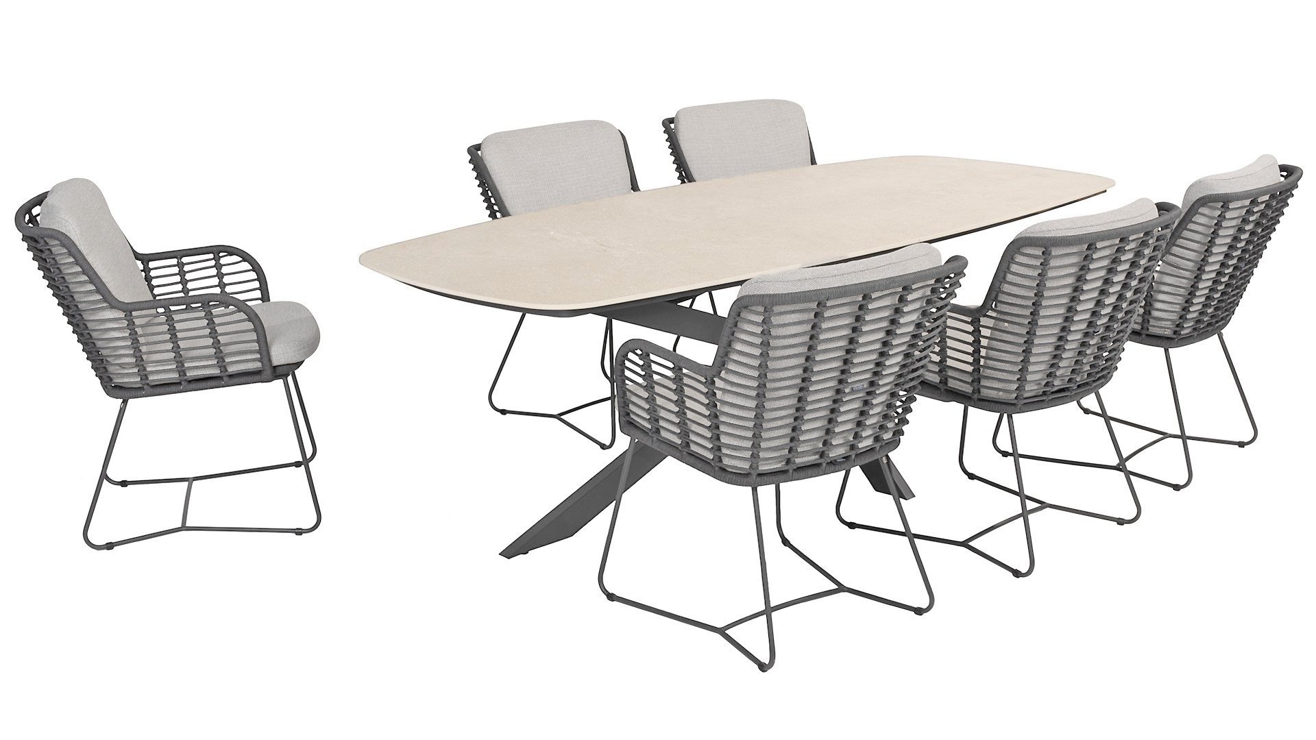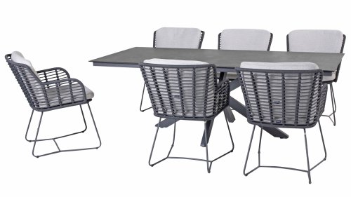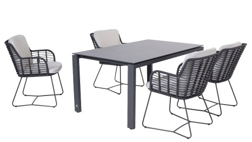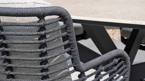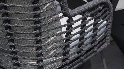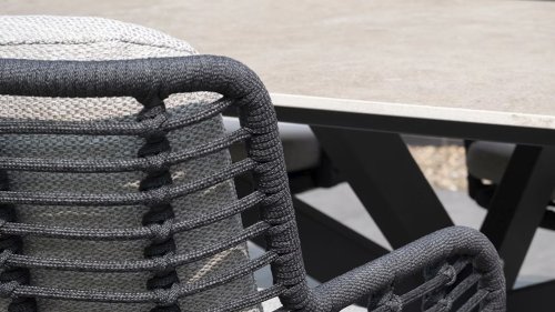 Der Rahmen des Fabrice 4SO Dining fließen in einander und dies wird fertiggemacht mit dem einzigartige Rope Geflechte. Rückenlehne und Sitzfläche ist mit dieser starken Rope geflochten und gibt ein fest, aber bequem Sitzen. Die schönen Rahmen sind aus Aluminium. Ein schönes, flaches Seil (Rope) mit einem weichen und komfortablen Aussehen wurde in den Rahmen eingewebt. Die runden und Eckige Formen erhalten das Gleichgewicht dieses modernen Designs. Der Rahmen ist eine spielerische und zerbrechlich Zusammenspiel von glatten Linien, die wieder zusammen kommen und auseinander gehen, ein fest für die Augen!