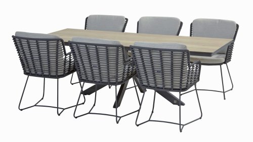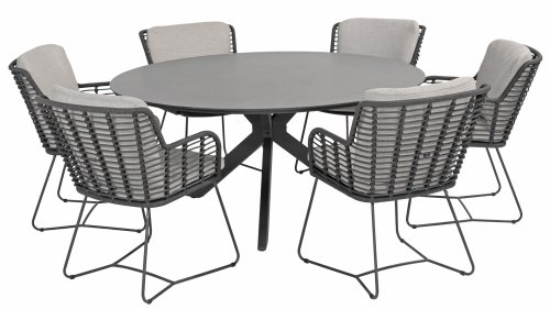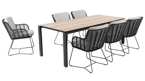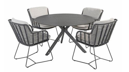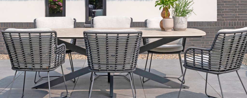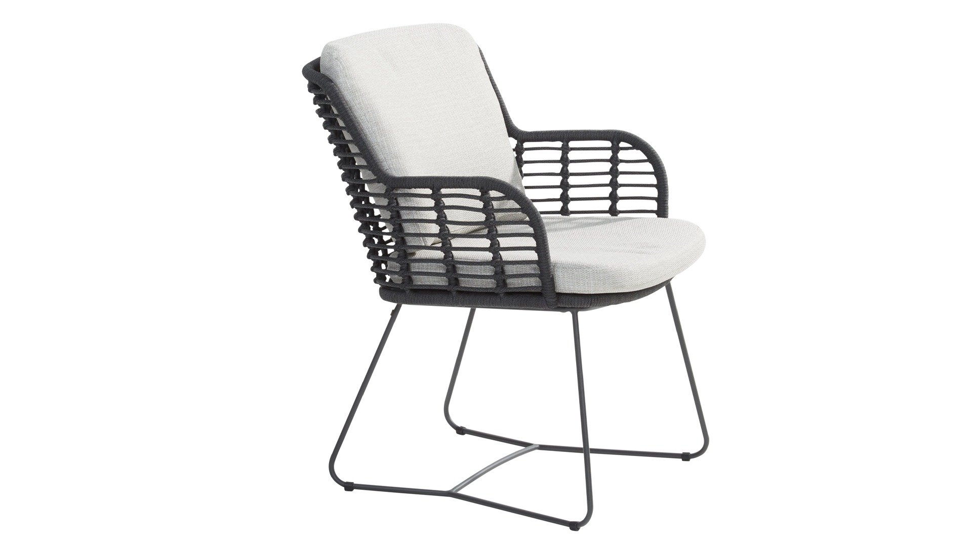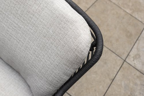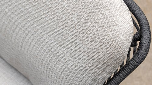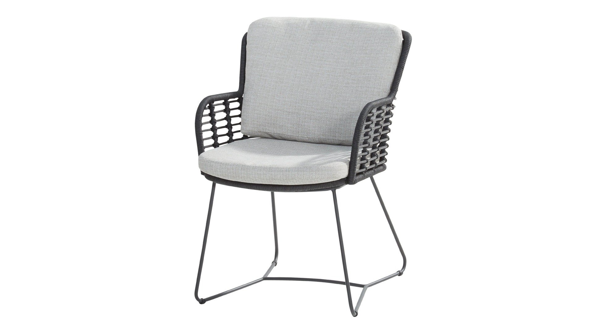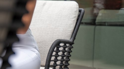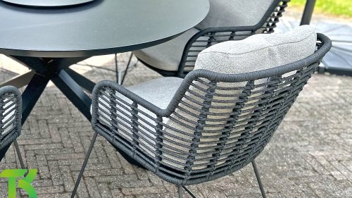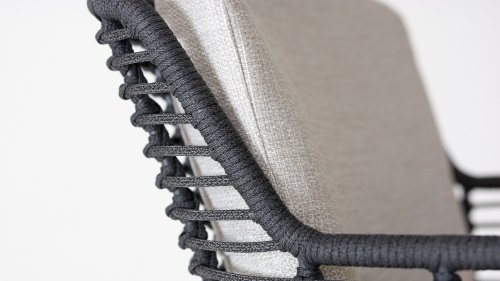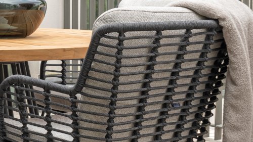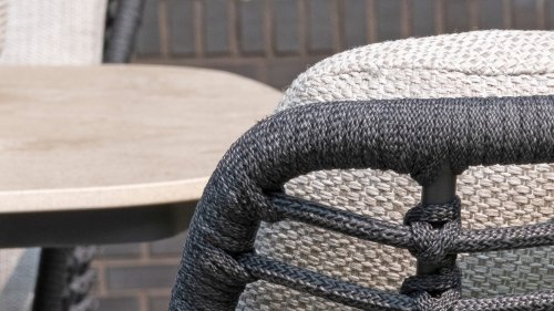 Hergestellt aus den besten Materialien, hergestellt mit Leidenschaft. Diese Dining Serie hat nicht nur Flair, sondern auch einen hervorragenden Sitzkomfort. Das dicht gewebte Seil besteht aus einem Kunststoffseil, das einen Kern enthält, der es farbecht, schimmel- und UV-beständig macht. Die Kissen bestehen aus Olefin, das farbecht, bequem und wasserabweisend ist. Die Kombination der Kissen zusammen mit einer abgewinkelten Rückenlehne sorgt für einen bequemen Sitz. Ein Design von 4 Seasons, das eine Augenweide ist. Der Stuhl ist auch in folgenden Farben erhältlich: Anthrazit, Latte & Terre
