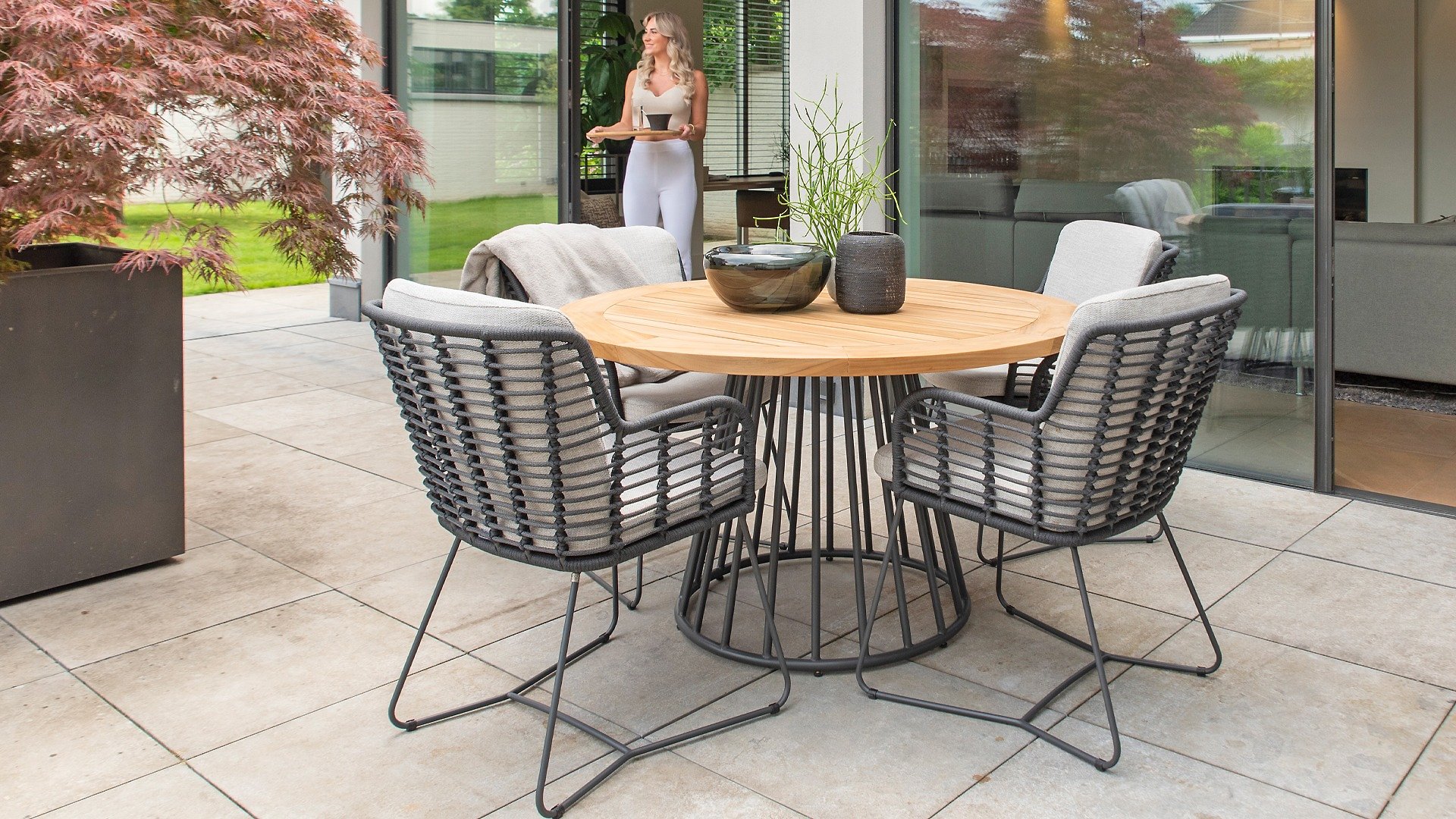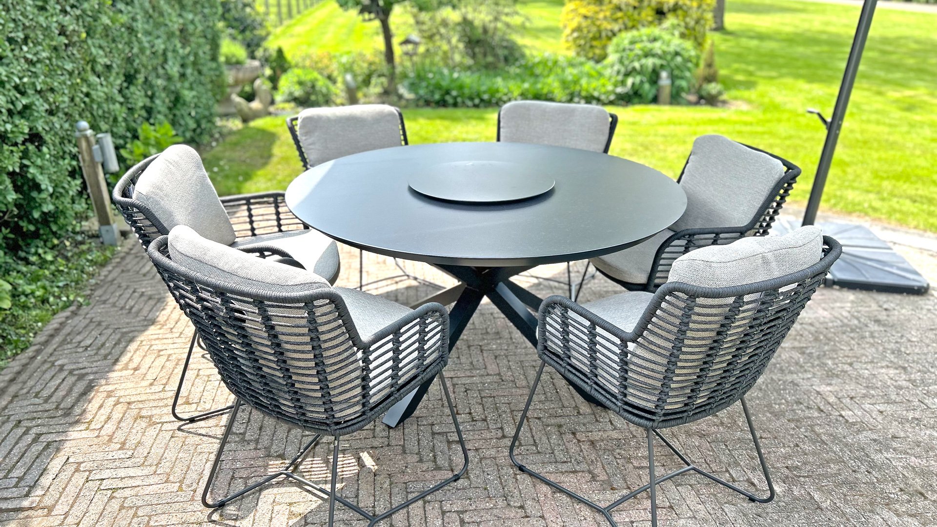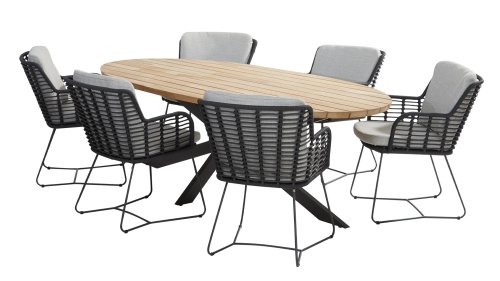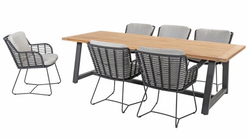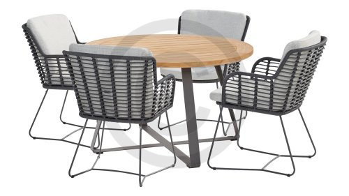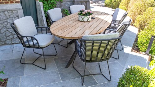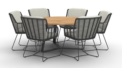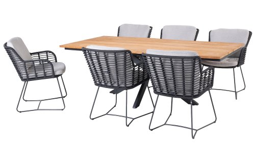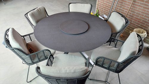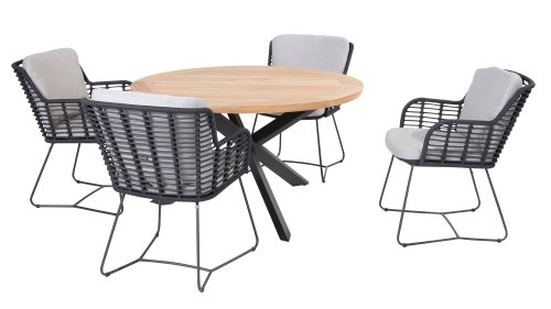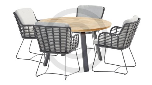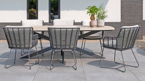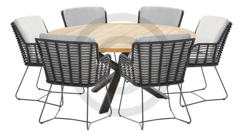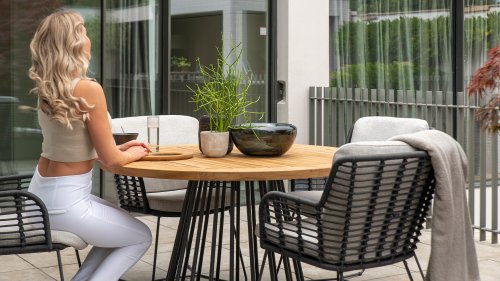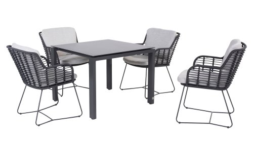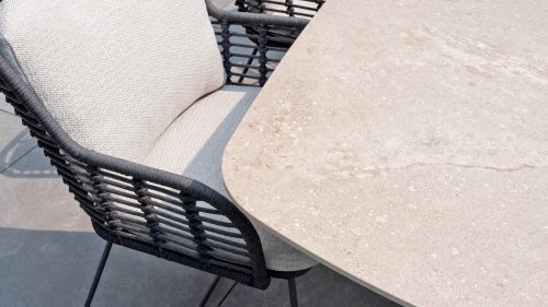 Hergestellt aus den besten Materialien, hergestellt mit Leidenschaft. Diese Dining Serie hat nicht nur Flair, sondern auch einen hervorragenden Sitzkomfort. Das dicht gewebte Seil besteht aus einem Kunststoffseil, das einen Kern enthält, der es farbecht, schimmel- und UV-beständig macht. Die Kissen bestehen aus Olefin, das farbecht, bequem und wasserabweisend ist. Die Kombination der Kissen zusammen mit einer abgewinkelten Rückenlehne sorgt für einen bequemen Sitz. Ein Design von 4 Seasons, das eine Augenweide ist. Der Stuhl ist auch in folgenden Farben erhältlich: Anthrazit, Latte & Terre