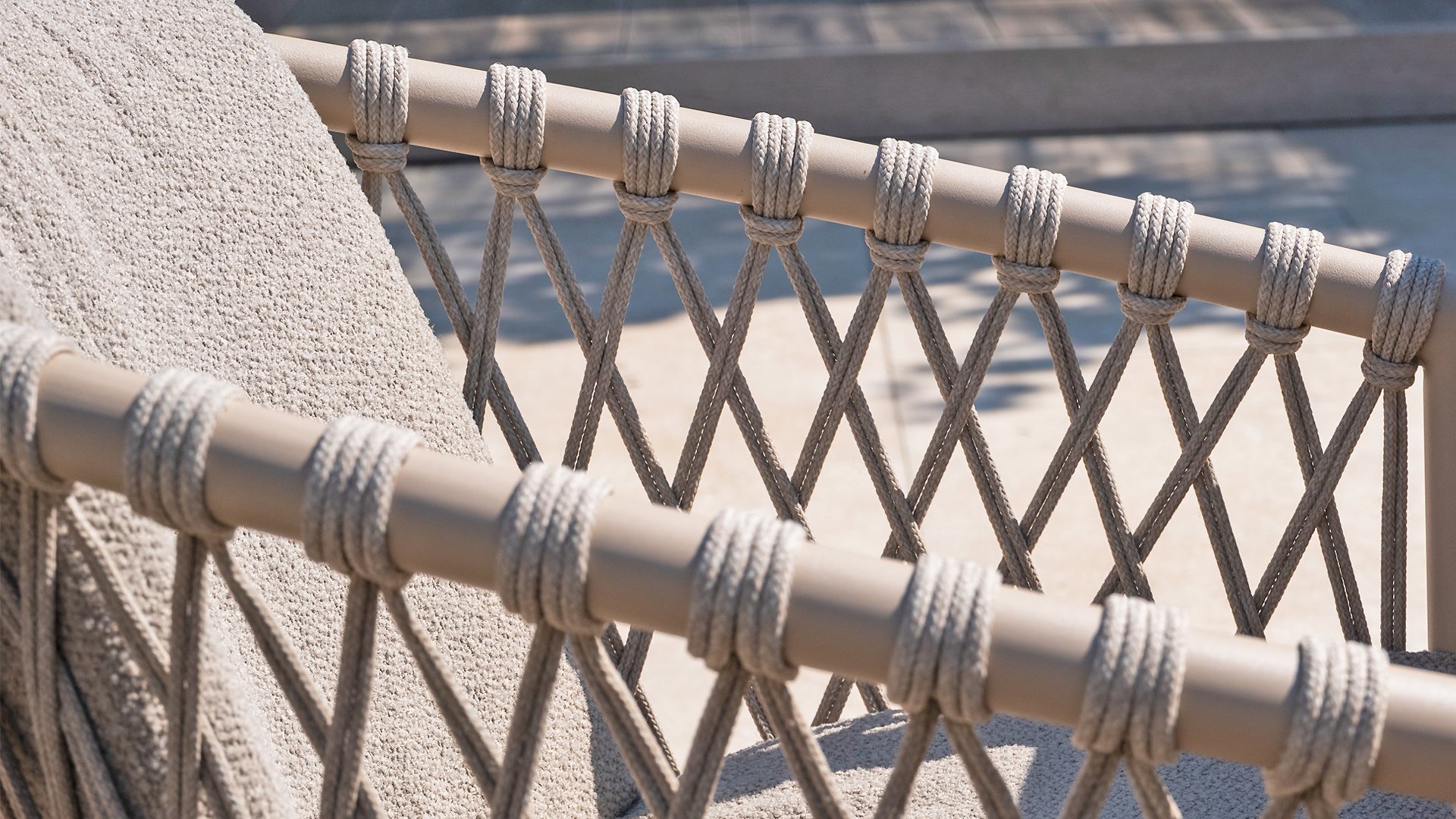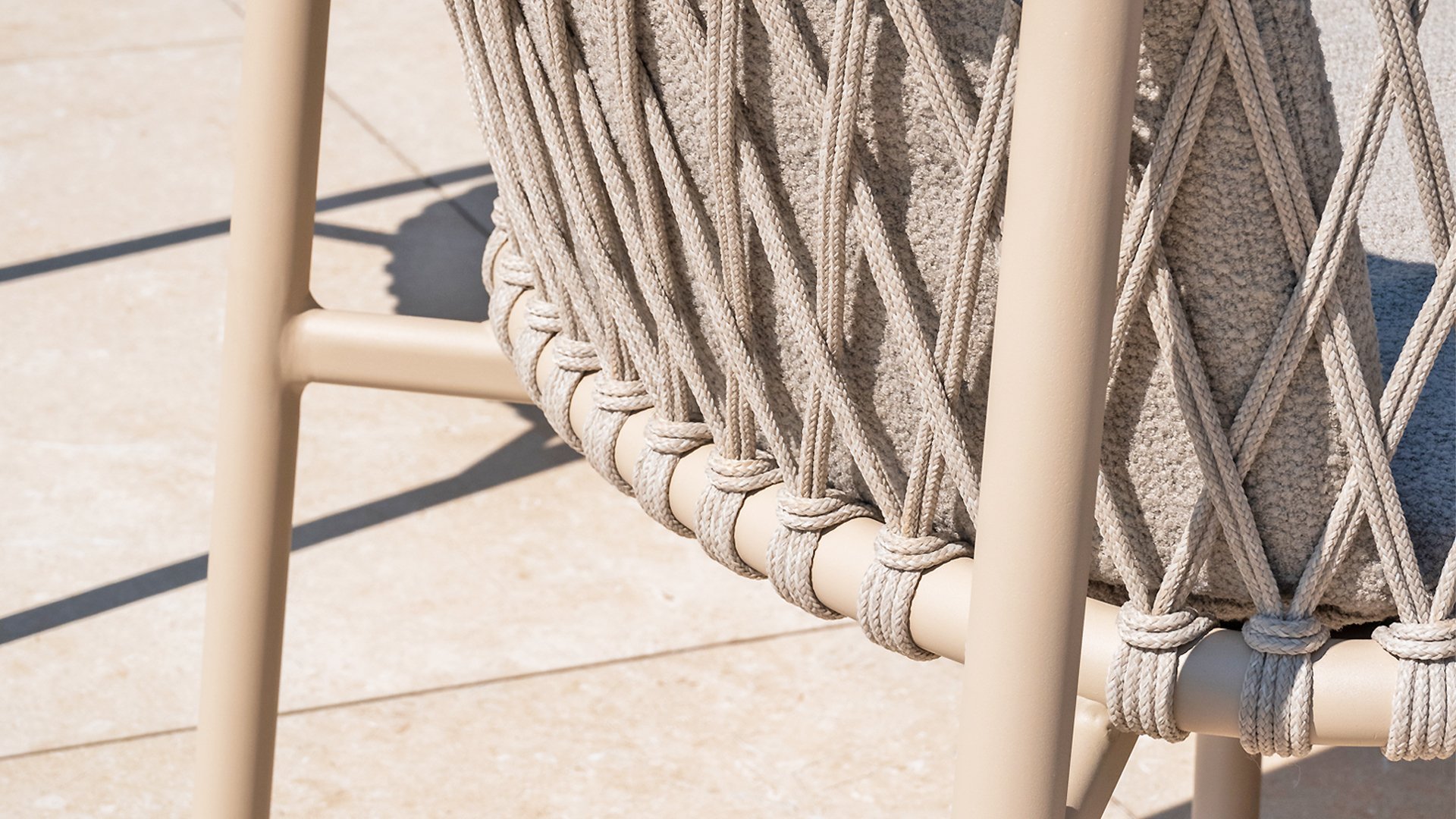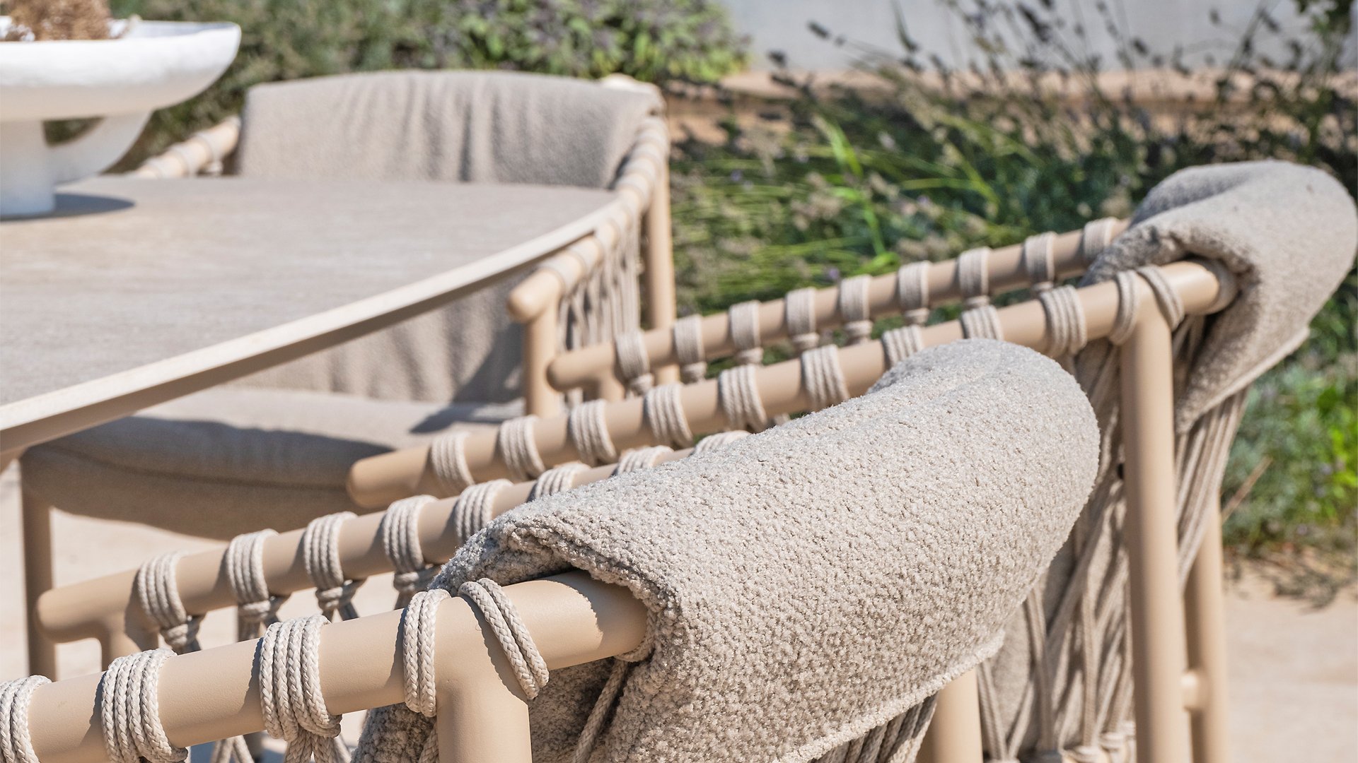 Dieses wunderschöne Material eignet sich perfekt für den Außenbereich, denn Rope ist nicht nur eine normale Spitze, an der Sie Ihre Schuhe binden können. Unsere runden Fäden sind mit einem Kunststoffkern versehen. Diese Basis aus Polypropylen sorgt dafür, dass sich das Rope minimal dehnt und sie nimmt außerdem keine Feuchtigkeit auf. Die Umhüllung besteht aus Acrylstoff, der mit dem wetterfesten Stoff unserer Gartenkissen vergleichbar ist. Diese Umhüllung fühlt sich weich an und ist sehr wasserabweisend, UV-beständig und farbecht. Die flachen Rope-Varianten besitzen den gleichen wetterfesten Materialmix, doch das Polypropylen-Material wurde hier mit dem Acryl-Stoff verwebt. Durch diese Technik besitzt das flache Rope die gleichen Eigenschaften, hat jedoch eine ganz andere Ausstrahlung.
