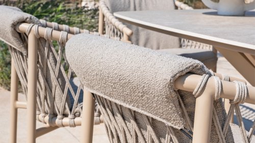 Der Stoff des Sitzes besteht aus Olefin, einem synthetischen Material, das für seine Festigkeit und Wetterbeständigkeit bekannt ist. Die Polsterung aus Bouclé-Ton sorgt für eine luxuriöse und weiche Textur, die sowohl ästhetisch ansprechend als auch praktisch ist. In der Allora-Serie ist auch ein Loungegruppe erhältlich: 4 Seasons Outdoor Allora Loungegruppe, um das Ganze abzurunden!