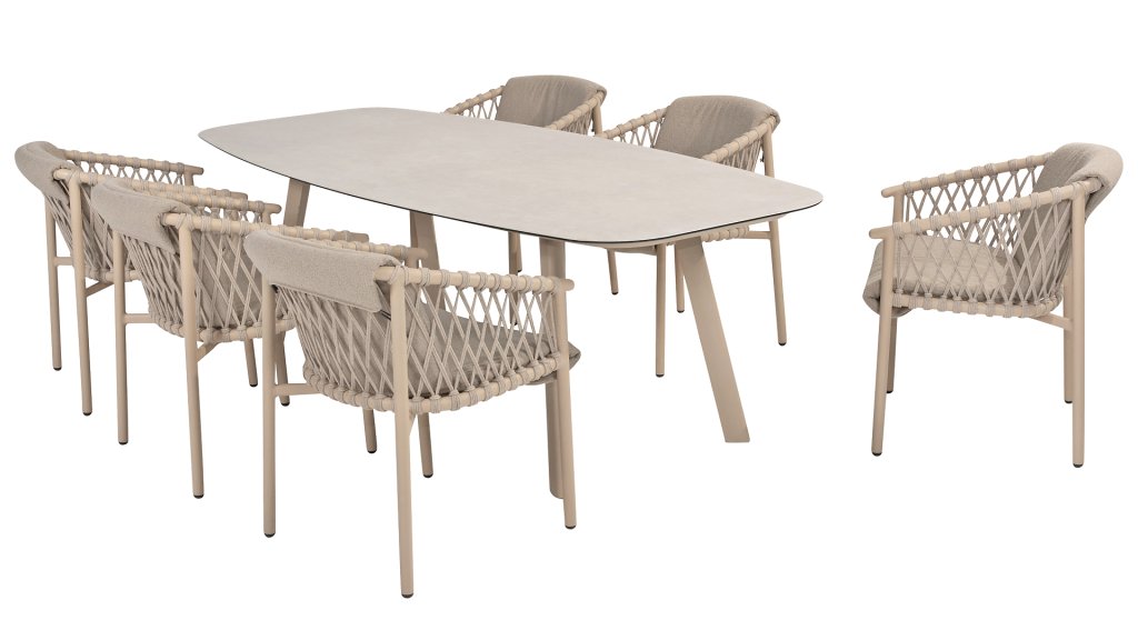 Suchen Sie einen pflegeleichten Tisch mit modernem Look? Dann sollten Sie den Taste by 4 Seasons Outdoor Manolo 240 cm in den Farben Anthrazit, Latte und Terre in Betracht ziehen. Die Form der Tischplatte und die Position der Aluminiumbeine machen diesen Tisch unglaublich praktisch. Diese Form schafft auf allen Seiten viel Platz. Das unverwechselbare Design des Tisches zeichnet sich durch eine dänische ovale Tischplatte aus glasbedruckter Keramik aus, sodass er das ganze Jahr über im Freien stehen kann. Kein Platz für einen 240 cm langen Tisch? Alternativ gibt es den Taste 4 Seasons Manolo 75cm oder 180cm; beide Größen sind in den Farben Latte, Anthrazit und Terre erhältlich.