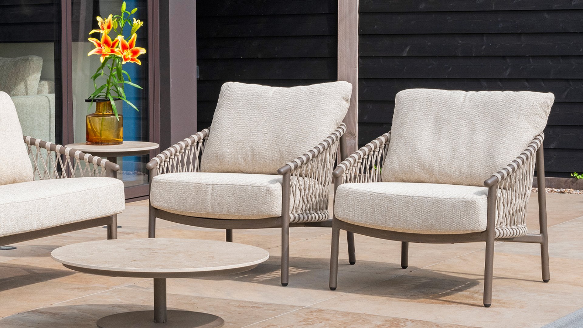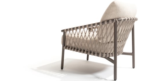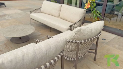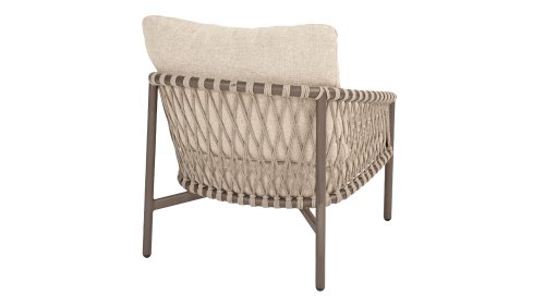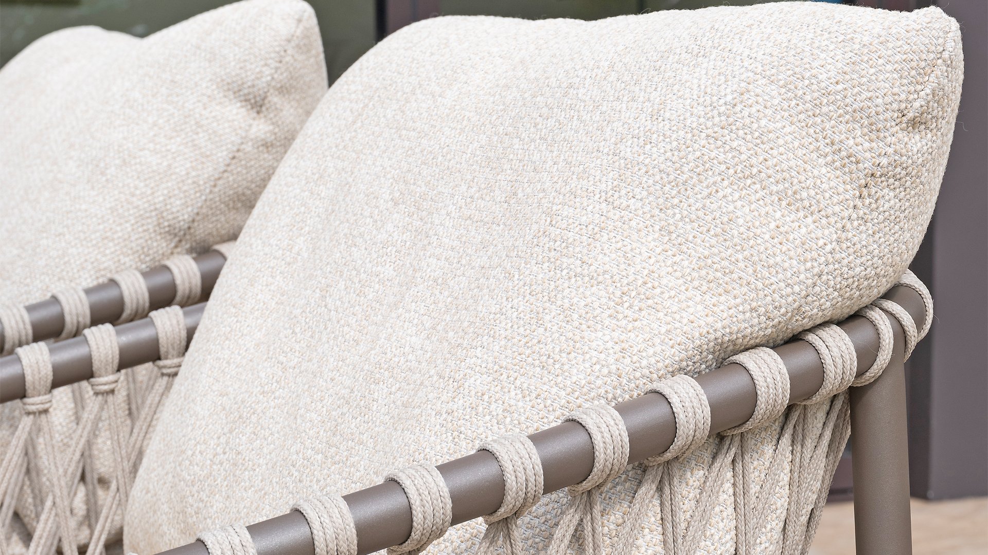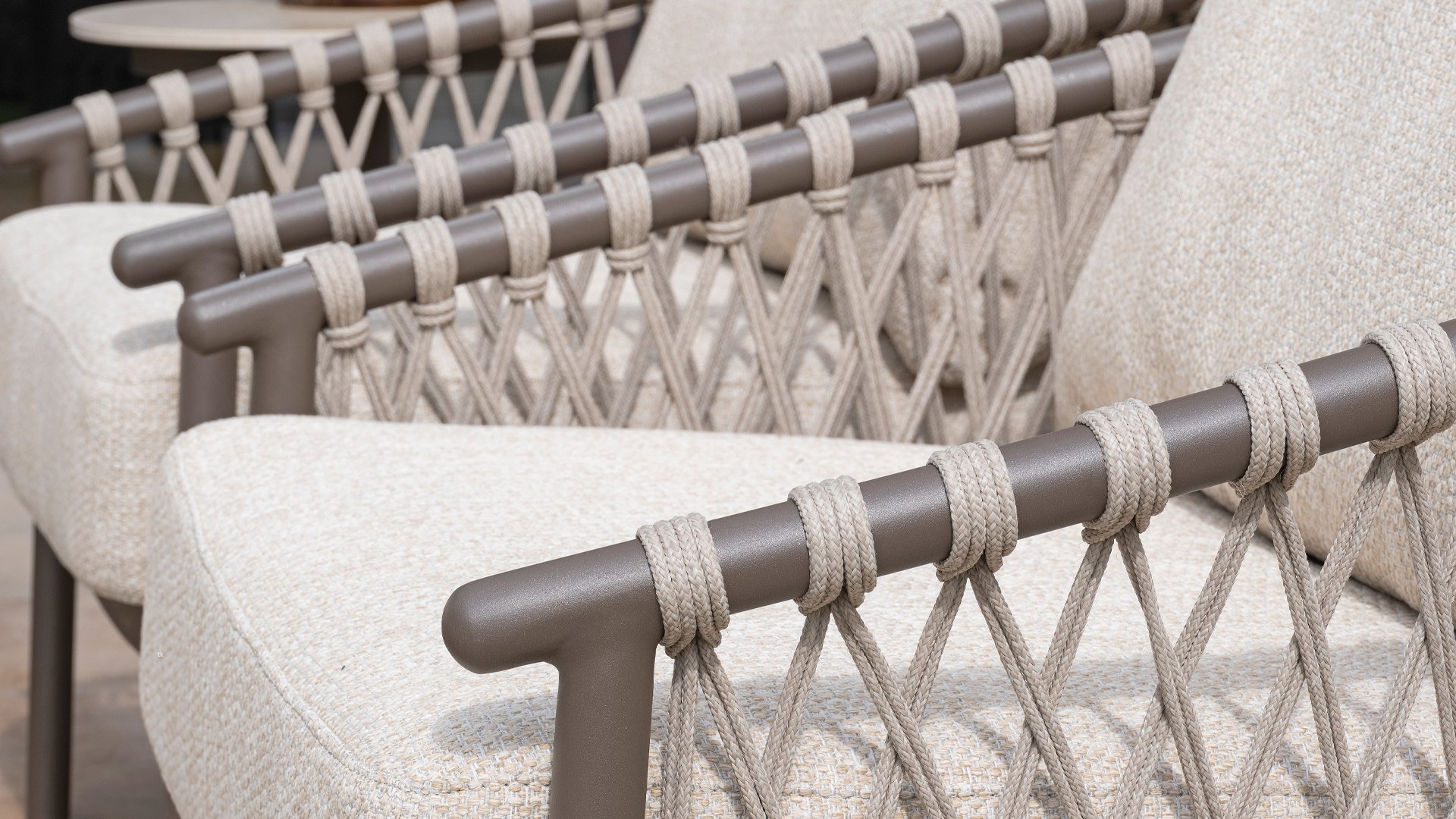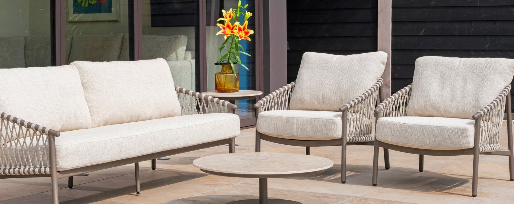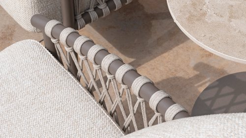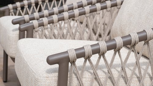 Das raffinierte Design von Allora ist bis ins kleinste Detail perfektioniert. Sowohl die Diningstühle als auch das Loungeset haben schlanke Rahmen und ein dezentes Seilmuster, das den runden Sitz betont. Die bequemen Kissen sind ebenfalls auf clevere Weise befestigt.
