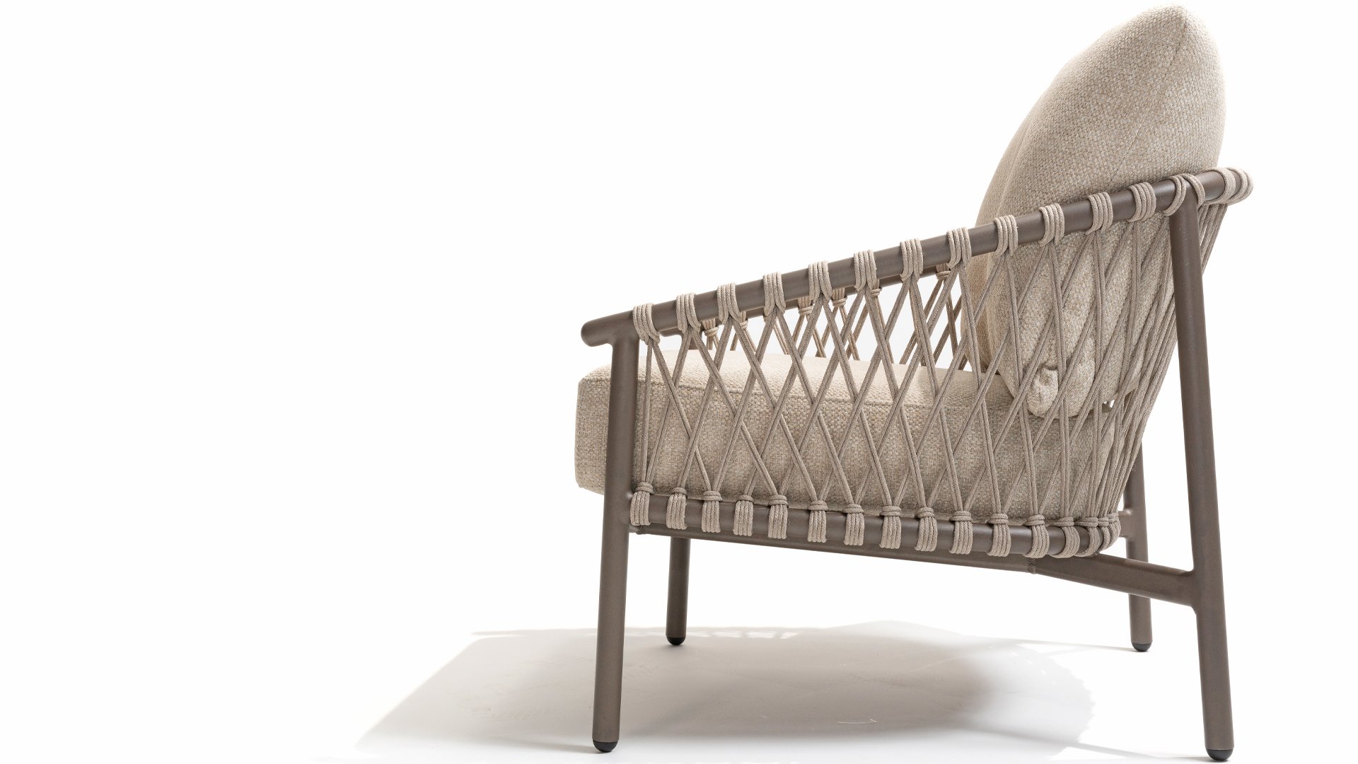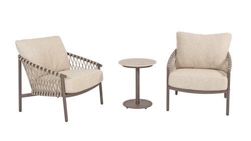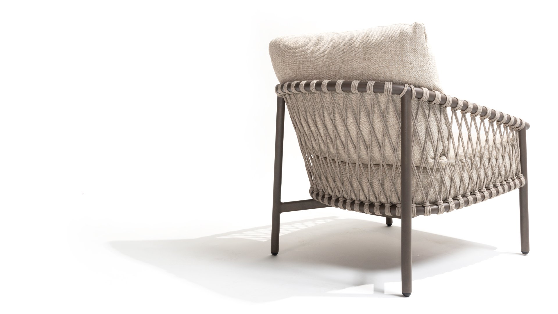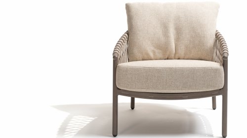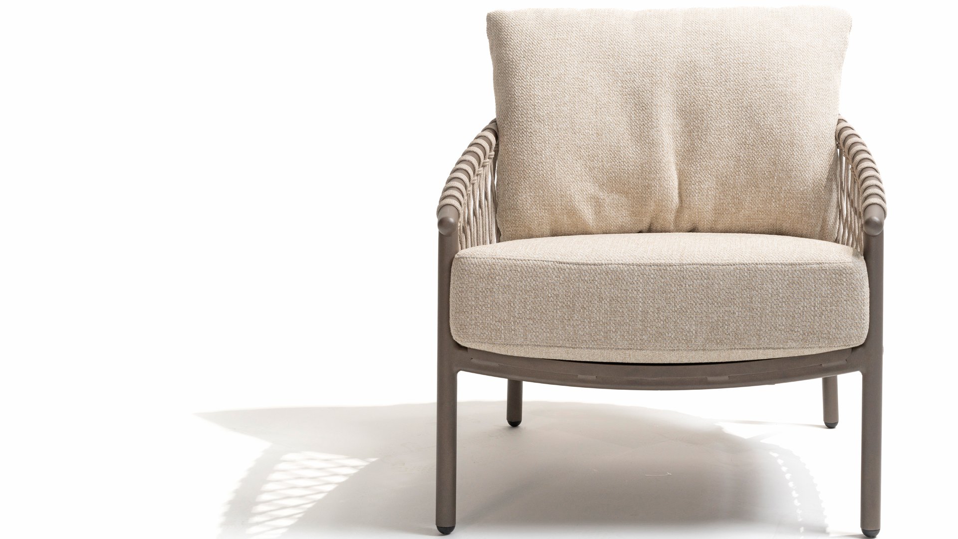Das raffinierte Design von Allora ist bis ins kleinste Detail perfektioniert. Sowohl die Diningstühle als auch das Loungeset haben schlanke Rahmen und ein dezentes Seilmuster, das den runden Sitz betont. Die bequemen Kissen sind ebenfalls auf clevere Weise befestigt.