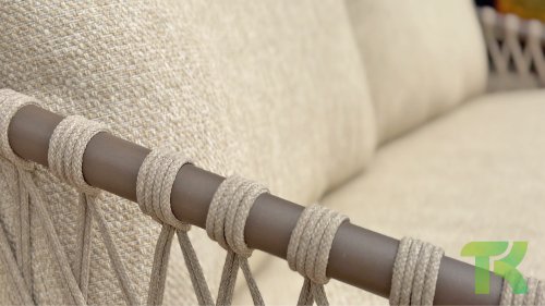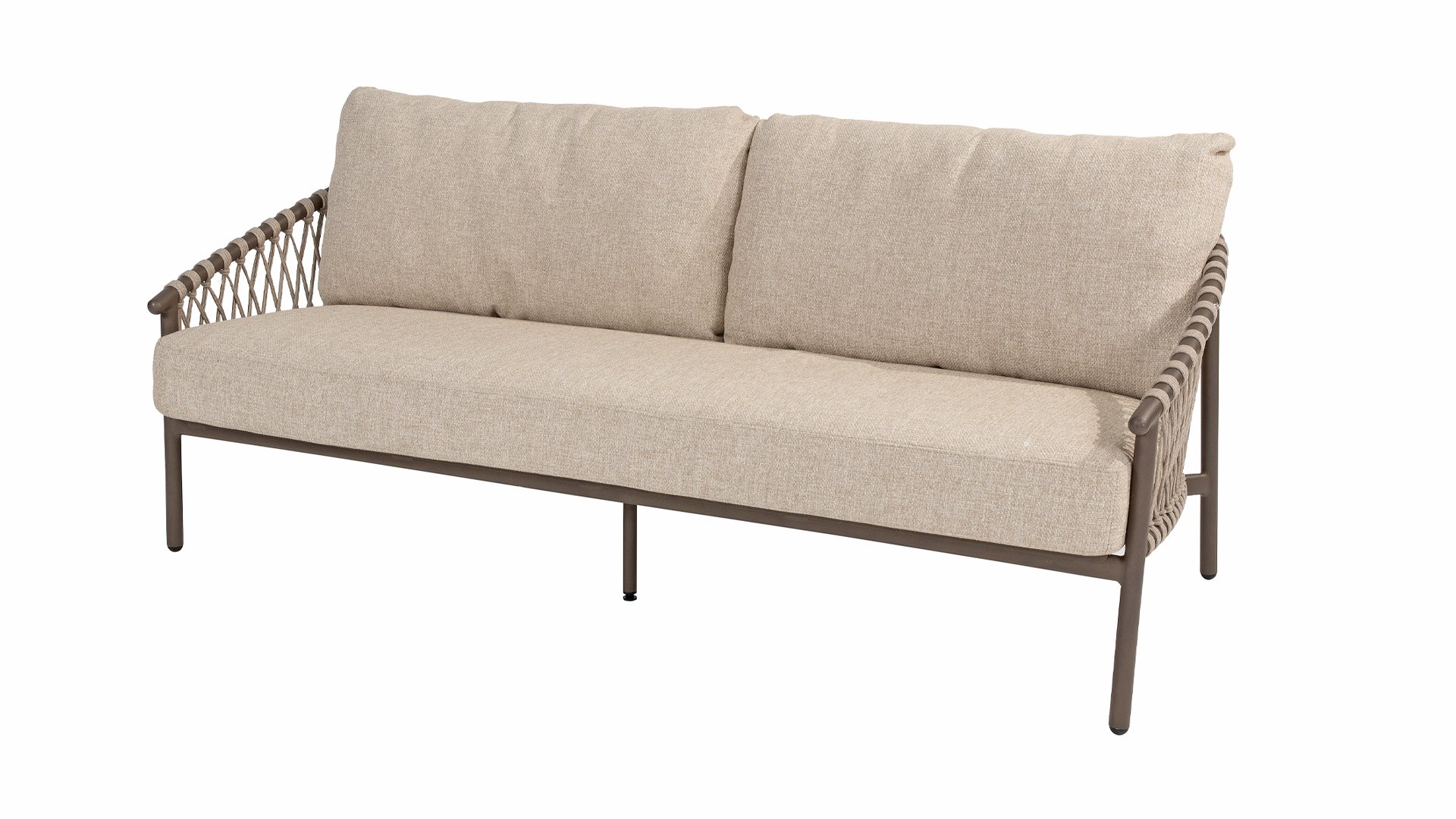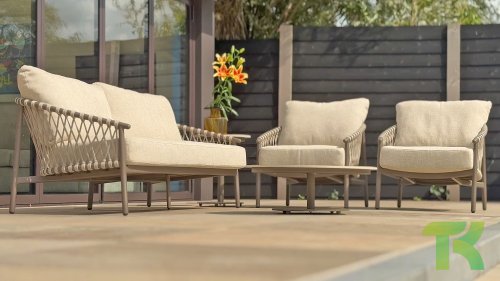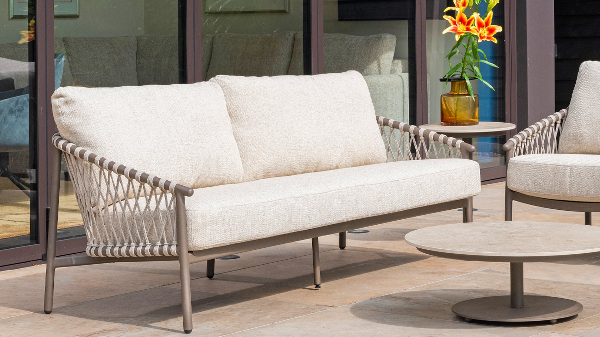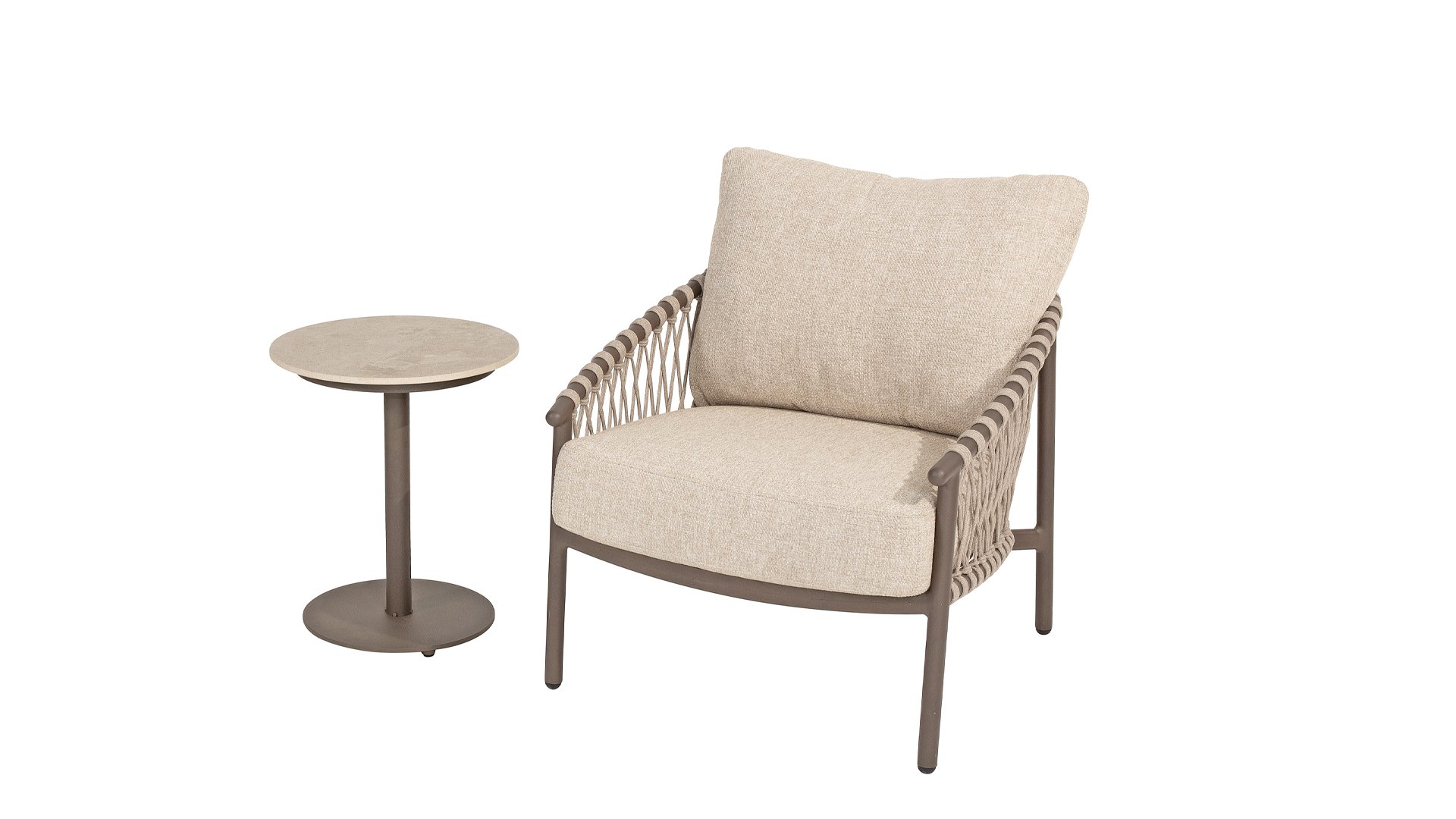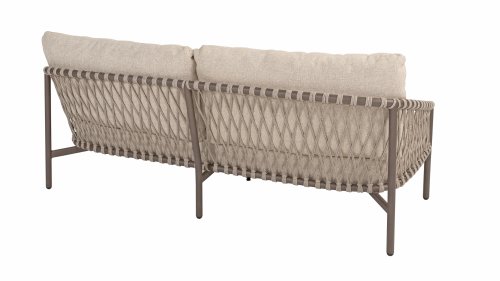 Das raffinierte Design von Allora ist bis ins kleinste Detail perfektioniert. Sowohl die Diningstühle als auch das Loungeset haben schlanke Rahmen und ein dezentes Seilmuster, das den runden Sitz betont. Die bequemen Kissen sind ebenfalls auf clevere Weise befestigt.