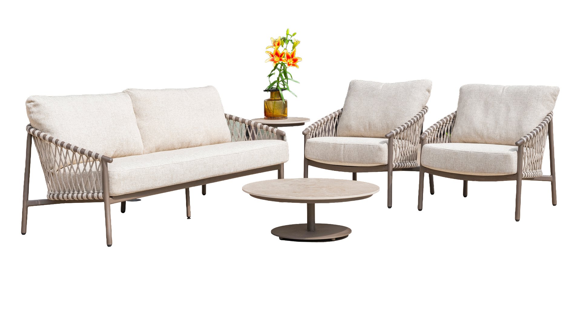 Entdecken Sie die ultimative Balance zwischen Stil und Komfort mit unserem Terra Metallic-Loungegruppe mit grauem Rope perfekt für Ihren Garten. Der 4SO Allora loungesets hat einen schlanken Metallrahmen in einem luxuriösen Bronzeton. Dies verleiht Ihrem Außenbereich eine moderne, raffinierte Note. Das weiche graue Seil sorgt nicht nur für einen eleganten Kontrast, sondern sorgt auch für außergewöhnlichen Komfort und Haltbarkeit. Das 4Seasons Allora Lounge ist wetterfest, pflegeleicht und so konzipiert, dass es den ganzen Sommer über Ihr Lieblingsort zum Entspannen ist. Verwandeln Sie Ihren Garten in eine Oase der Ruhe und des Stils – der perfekte Outdoor-Loungegruppe!