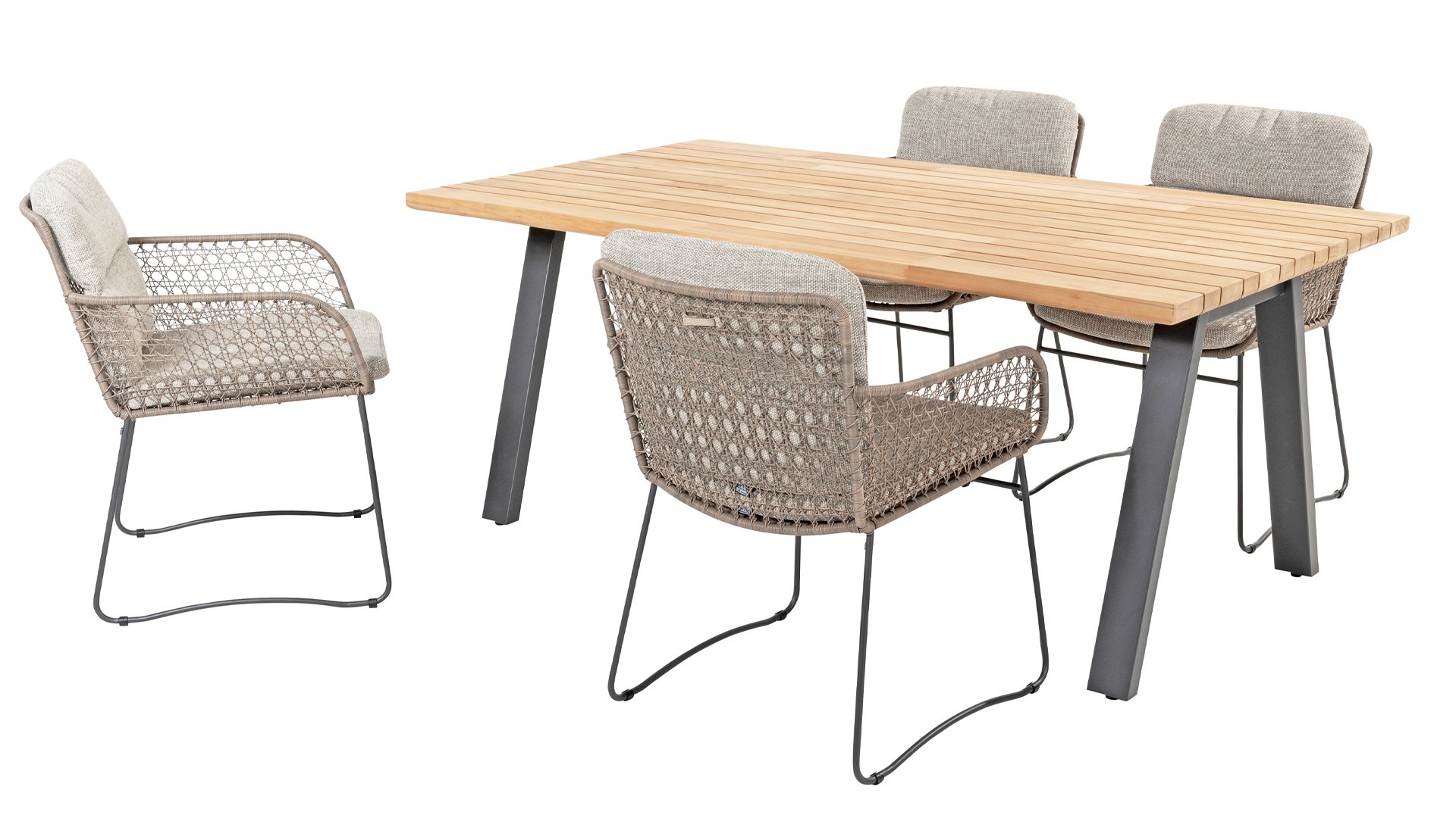 Entdecken Sie die Eleganz und Langlebigkeit des 4 Seasons Outdoor Esszimmerstuhls Aprilla in stilvollem Pure. Dieser Stuhl wird mit Kissen geliefert und hat ein schönes Muster aus naturelfarbenem Korbgeflecht und ein anthrazitfarbenes Edelstahlgestell.