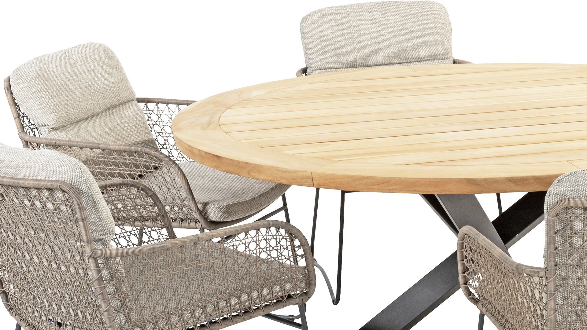Diesen Tisch können Sie getrost als das Highlight der Kollektion bezeichnen. Das hochwertige Teakholz in Kombination mit dem schönen Kreuzbein machen diesen Taste by 4Seasons Prado 160cm Tisch zu einem Schmuckstück. Mit fast jedem Esszimmerstuhl aus unserer Kollektion ist für jeden etwas dabei. Kann mit Prado Lazy Susan kombiniert werden.