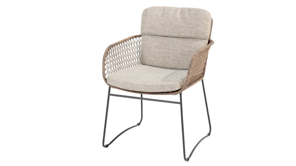 Entdecken Sie die Eleganz und Langlebigkeit des 4 Seasons Outdoor Aprilla Pure Dining Chairs in stilvollem Taupe. Dieser Stuhl wird mit Kissen geliefert und verfügt über ein wunderschönes Muster aus anthrazitfarbenem Geflecht und einem anthrazitfarbenen Edelstahlgestell.