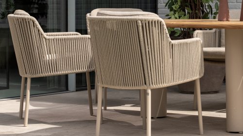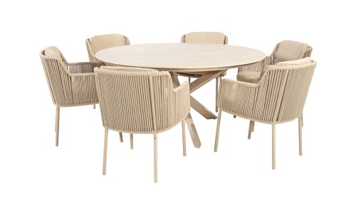 Verleihen Sie Ihrem Außenbereich mit dem 4 Seasons Outdoor Bernini Gartenmöbel-Set in der neuen Farbe Latte ein stilvolles Upgrade. Dieses luxuriöse Esszimmer-Set ist vom legendären italienischen Künstler Bernini inspiriert, der für seine fließenden Linien und sein raffiniertes Design bekannt ist. Diese Eleganz spiegelt sich in den modernen, abgerundeten Schalenstühlen und der hochwertigen Verarbeitung dieses trendsetzenden Gartenmöbel-Sets wider.