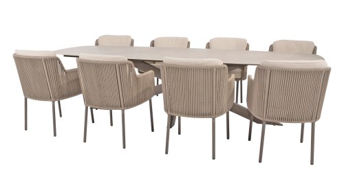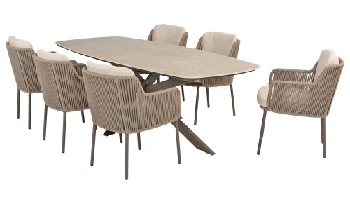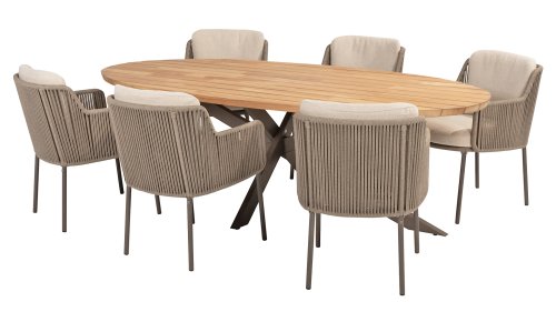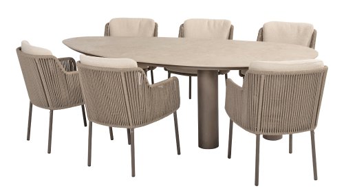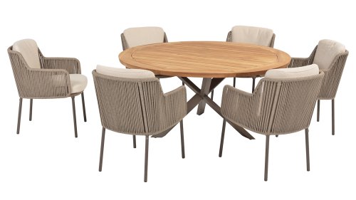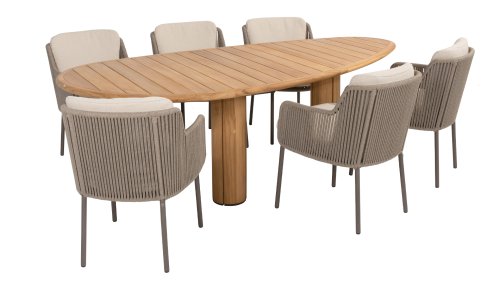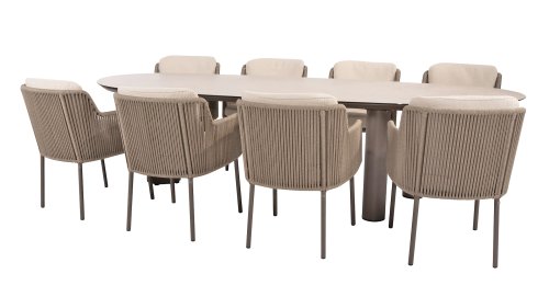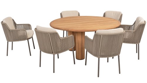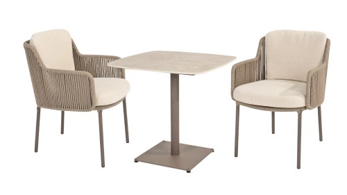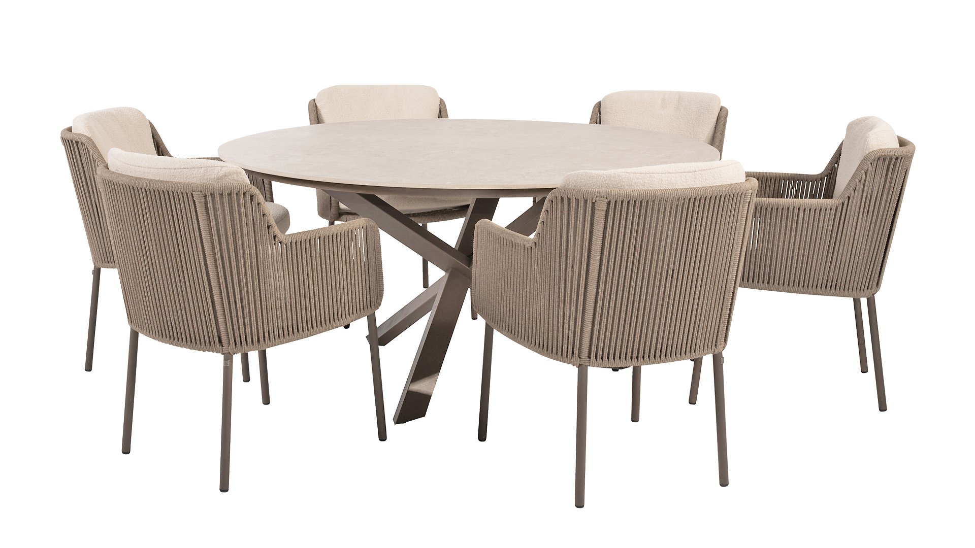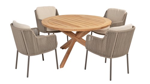Alte Liebe rostet nicht. Mit seinen runden Formen und der zurückhaltenden Terre-Farbe lassen sich die Bernini-Stühle leicht mit verschiedenen 4SO-Tischen kombinieren. Der runde Sitz mit handgewebtem Seil sorgt für fantastischen Komfort. Die dicken Kissen sind mit reichhaltigem Bouclé-Stoff bezogen, sodass Sie stundenlang die Natur genießen können.