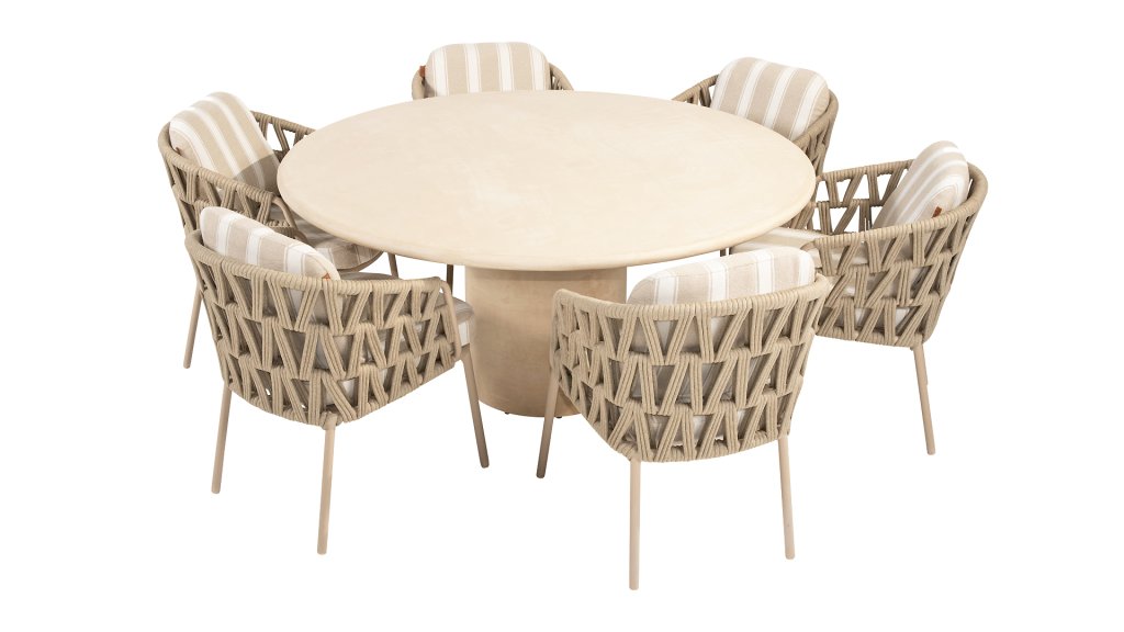 Der Hampton ist aus hochwertigem Mortex gefertigt, einem langlebigen und wasserfesten Material, das für seine natürliche Optik und außergewöhnliche Wetterbeständigkeit bekannt ist. Jede Tischplatte wird von Hand bearbeitet und schafft so einen einzigartigen, warmen Look, der sowohl moderne als auch mediterrane Gärten perfekt ergänzt.