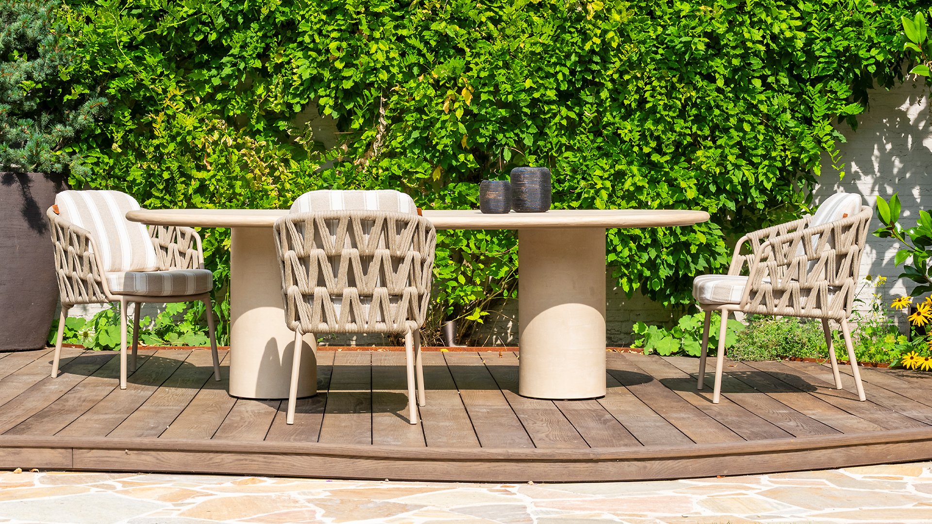Dieses wunderschöne Material eignet sich perfekt für den Außenbereich, denn Rope ist nicht nur eine normale Spitze, an der Sie Ihre Schuhe binden können. Unsere runden Fäden sind mit einem Kunststoffkern versehen. Diese Basis aus Polypropylen sorgt dafür, dass sich das Rope minimal dehnt und sie nimmt außerdem keine Feuchtigkeit auf. Die Umhüllung besteht aus Acrylstoff, der mit dem wetterfesten Stoff unserer Gartenkissen vergleichbar ist. Diese Umhüllung fühlt sich weich an und ist sehr wasserabweisend, UV-beständig und farbecht. Die flachen Rope-Varianten besitzen den gleichen wetterfesten Materialmix, doch das Polypropylen-Material wurde hier mit dem Acryl-Stoff verwebt. Durch diese Technik besitzt das flache Rope die gleichen Eigenschaften, hat jedoch eine ganz andere Ausstrahlung.