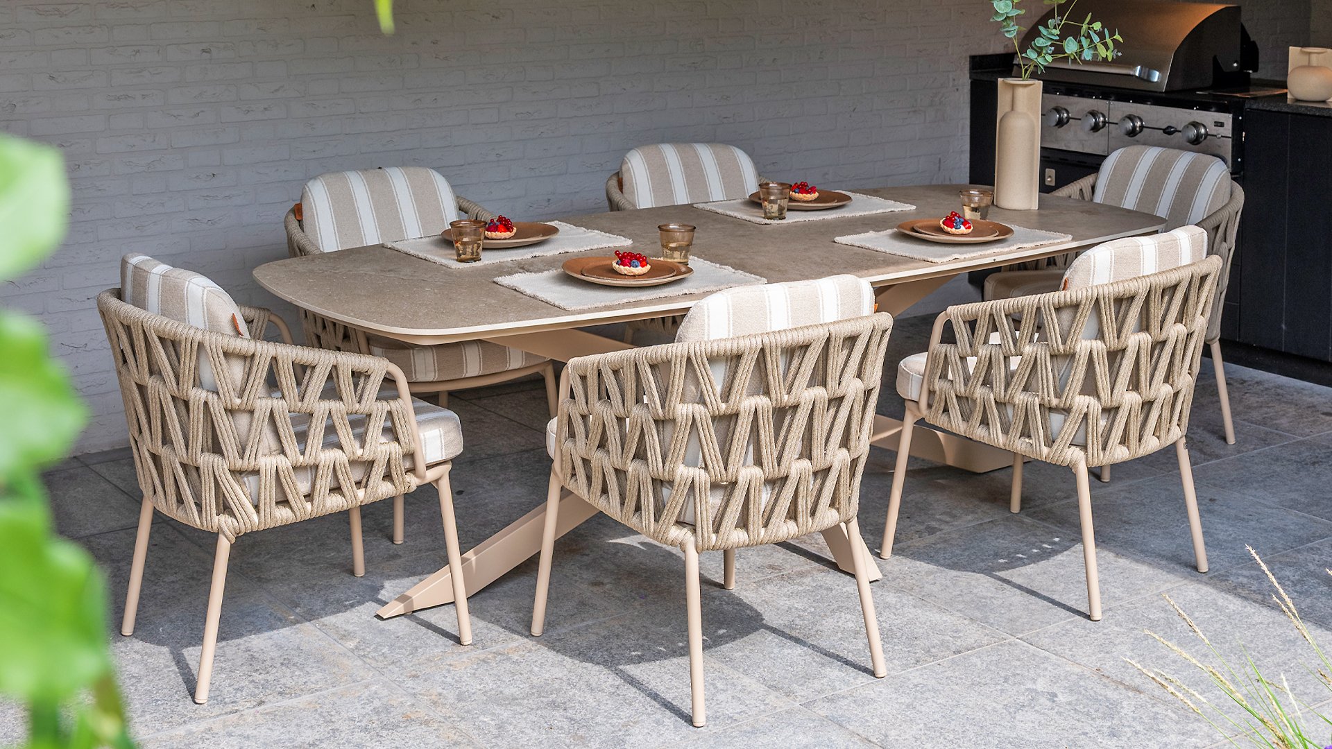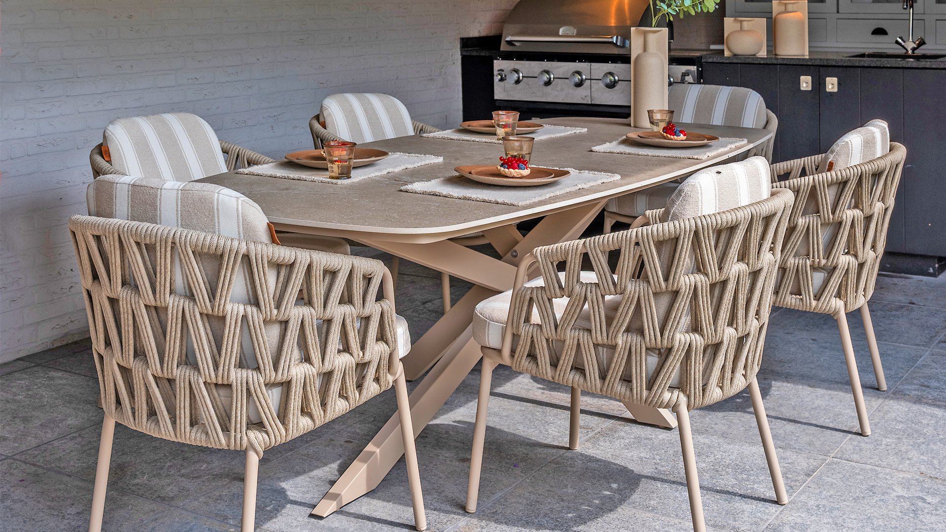 Mit seinem zeitlosen Design und den hochwertigen Materialien ist der Beverley Gartenstuhl nicht nur ein Blickfang, sondern auch für jahrelange Freude konzipiert. Das Gestell besteht aus robustem, pulverbeschichtetem Aluminium in einem warmen Sandton und ist mit handgeflochtenem Seil in einem eleganten Muster verziert. Die Olefin-Kissenbezüge sind wetterbeständig, farbecht und schnelltrocknend – ideal für das europäische Klima.