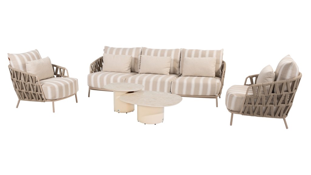 Der Rahmen besteht aus robustem, pulverbeschichtetem Aluminium in einem warmen Sandton und ist mit handgeflochtenem Rope in einem eleganten Muster versehen. Die dicken Kissen bieten nicht nur eine luxuriöse Optik, sondern auch hervorragenden Sitzkomfort. Die Olefin-Kissenbezüge sind wetterfest, farbecht und schnelltrocknend – ideal für das deutsche Klima.