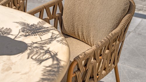 Die bequeme Kissen aus weichem Bouclé-Stoff sorgen für unvergleichlichen Sitzkomfort, sodass Sie stundenlang die Sonne genießen oder gemütliche Abende im Freien verbringen können. Der Bouclé-Stoff fügt nicht nur eine luxuriöse Note hinzu, sondern auch eine angenehme Textur, die zum Entspannen einlädt. Diese Lounge-Modelle sind für maximalen Komfort entworfen, egal ob Sie mit Freunden plaudern oder in aller Ruhe ein Buch lesen.