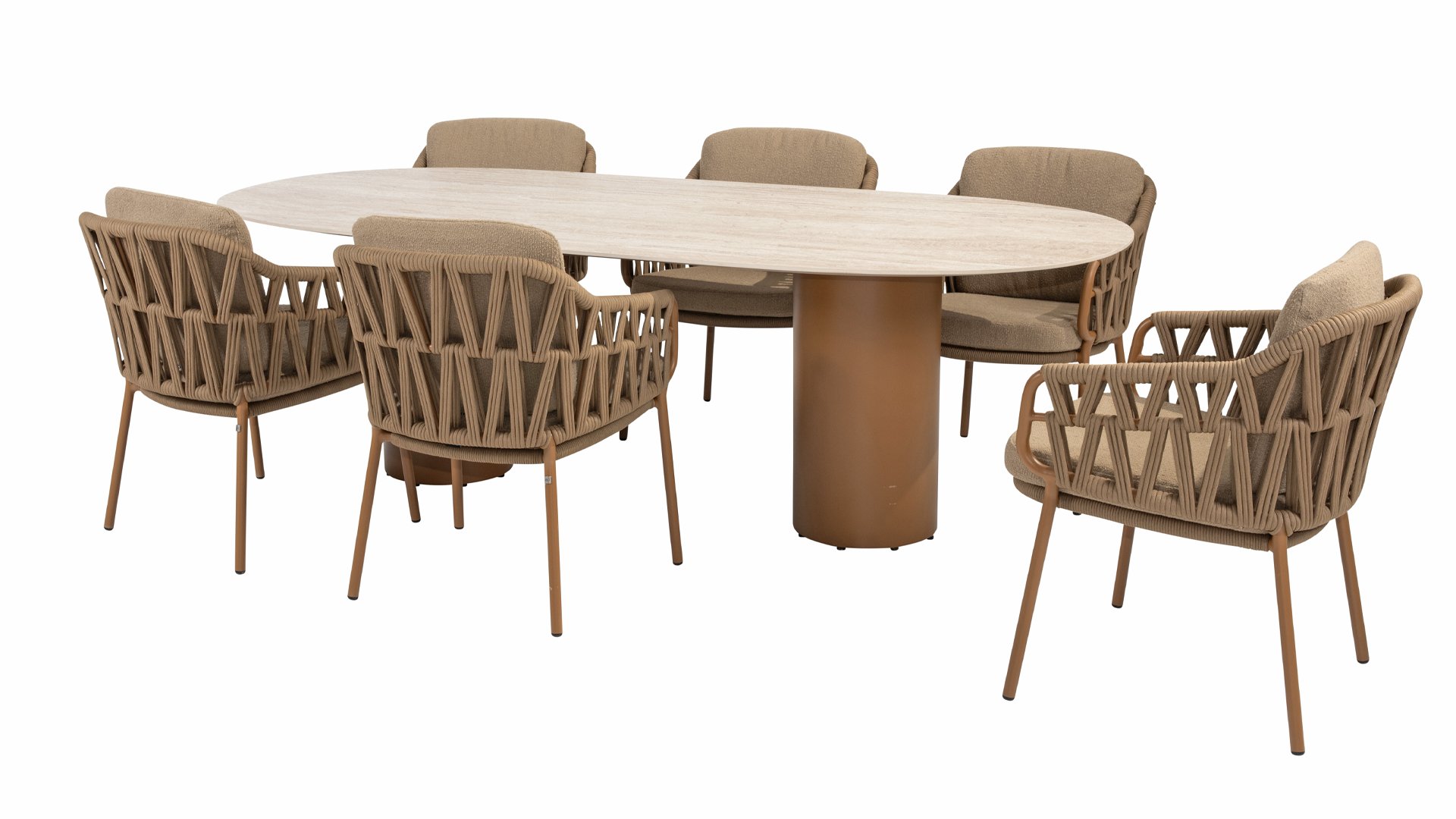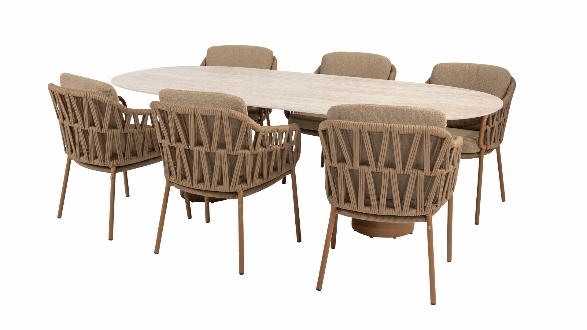 Der robuste Rahmen besteht aus pulverbeschichtetem Aluminium in einem warmen Erdton, kombiniert mit einem auffallend dicken Seilgeflecht. Diese handwerkliche Verarbeitung verleiht der Biarritz-Serie ein robustes und zugleich edles Aussehen. Die wetterbeständigen Olefin-Kissenbezüge sind UV- und schimmelresistent – ideal für jahrelangen Einsatz im Freien.