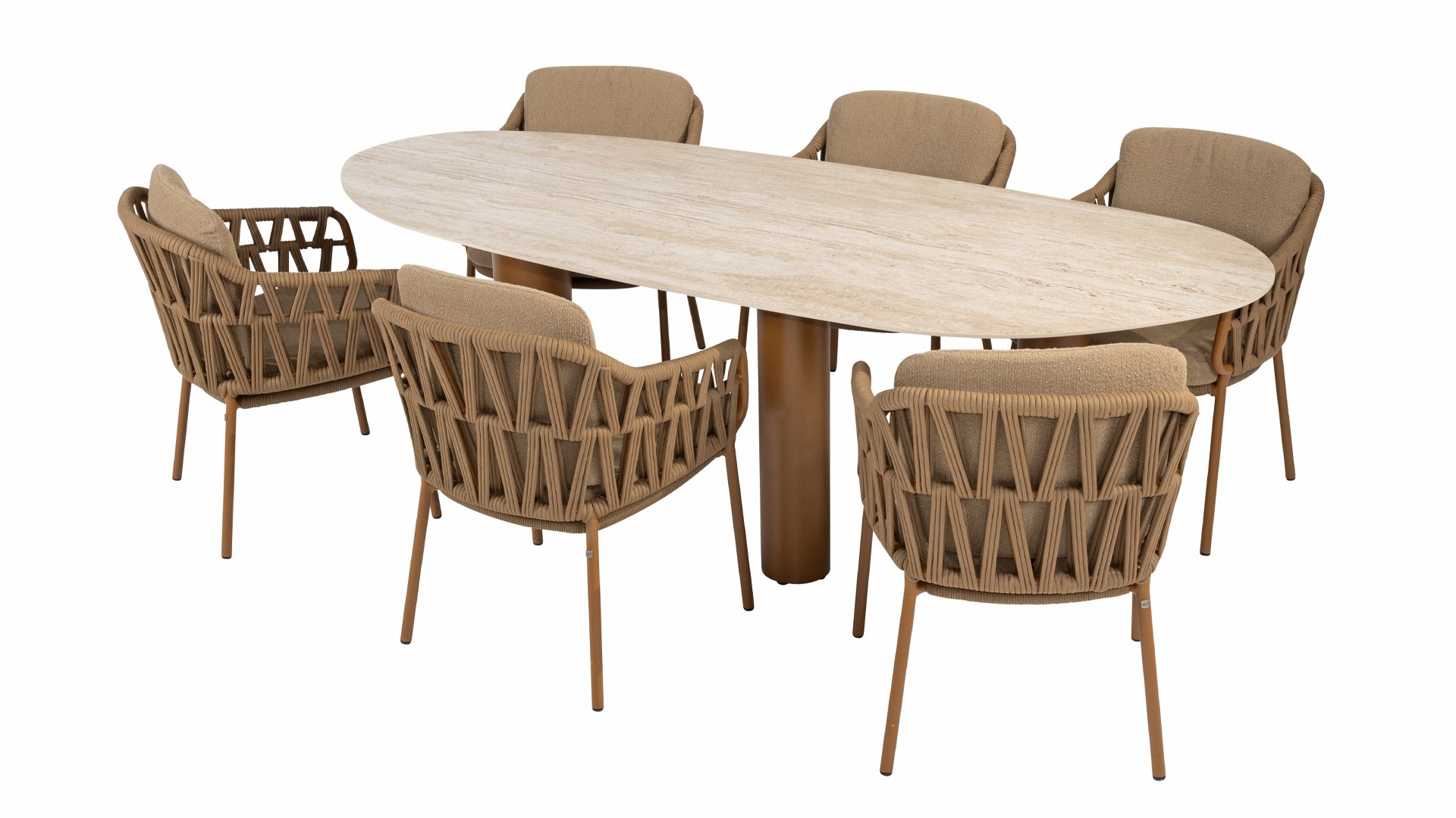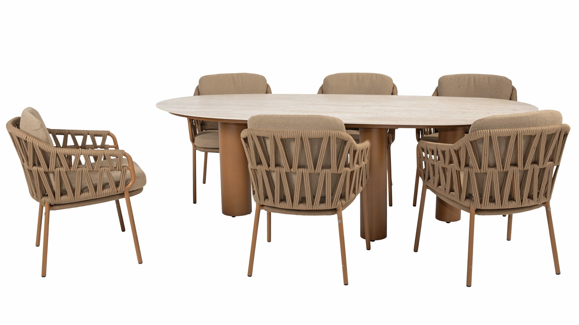 Der robuste Rahmen besteht aus pulverbeschichtetem Aluminium in einem warmen Erdton, kombiniert mit einem auffallend dicken Seilgeflecht. Diese handwerkliche Verarbeitung verleiht der Biarritz-Serie ein robustes und zugleich edles Aussehen. Die wetterbeständigen Olefin-Kissenbezüge sind UV- und schimmelresistent – ideal für jahrelangen Einsatz im Freien.