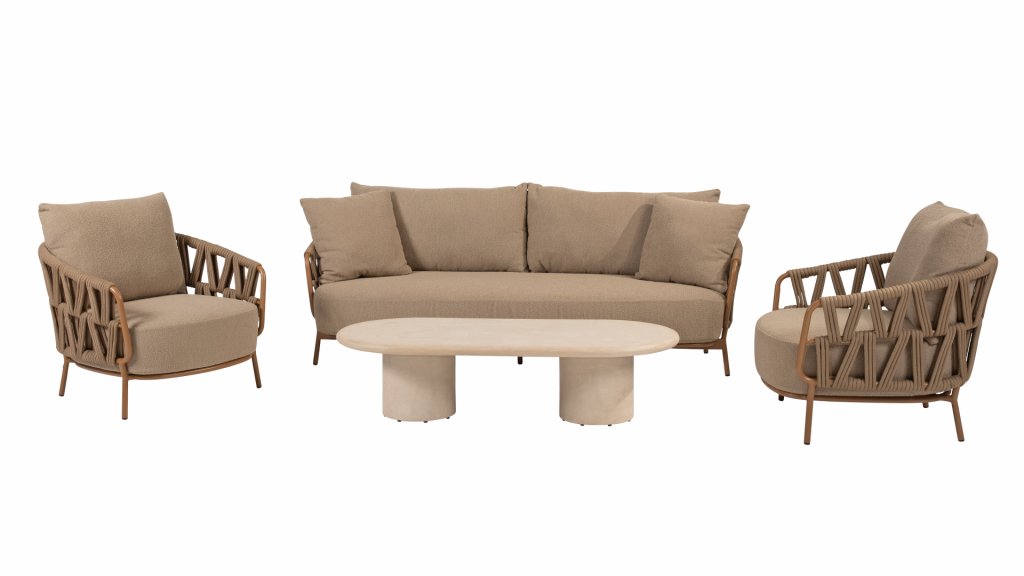 Der robuste Rahmen besteht aus pulverbeschichtetem Aluminium in einem warmen Erdton, kombiniert mit einem auffallend dicken Seilgeflecht. Diese handwerkliche Verarbeitung verleiht der Biarritz -Serie ein robustes und zugleich edles Aussehen. Die geräumigen Sitzflächen, die prallen Kissen und die weichen Texturen machen diese Lounge zu einem luxuriösen Ort für lange Sommertage.