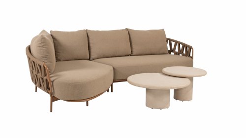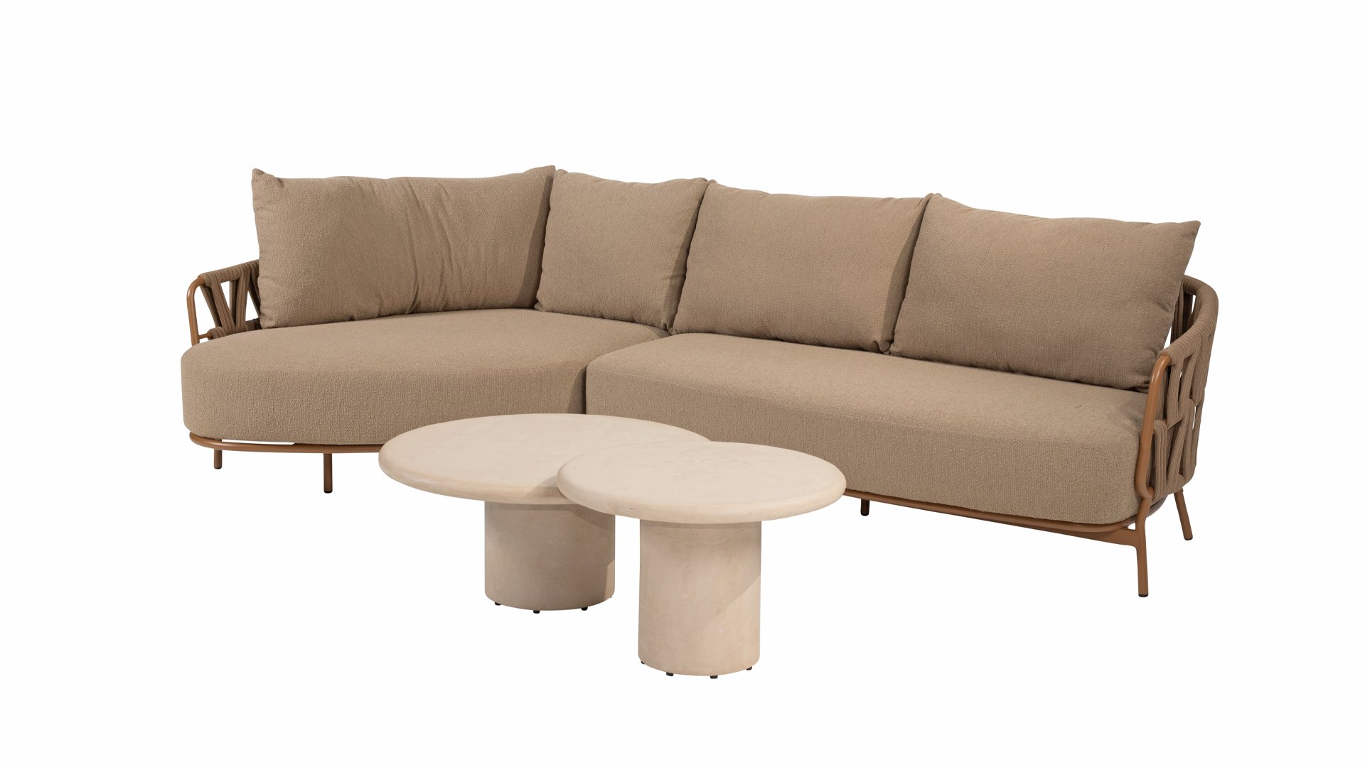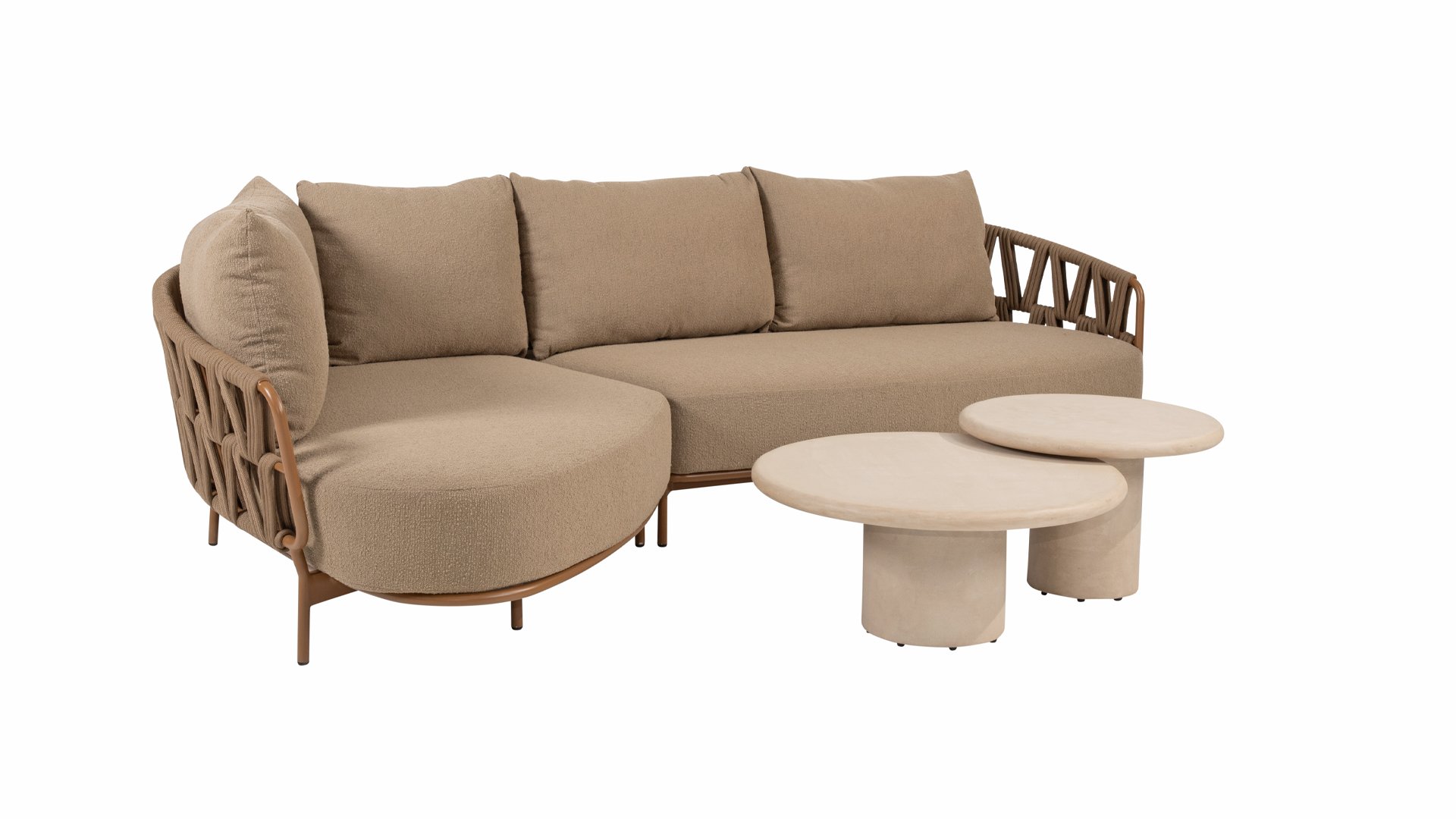 Der robuste Rahmen besteht aus pulverbeschichtetem Aluminium in einem warmen Erdton, kombiniert mit einem auffallend dicken Seilgeflecht. Diese handwerkliche Verarbeitung verleiht der Biarritz -Serie ein robustes und zugleich edles Aussehen. Die geräumigen Sitzflächen, die prallen Kissen und die weichen Texturen machen diese Lounge zu einem luxuriösen Ort für lange Sommertage.