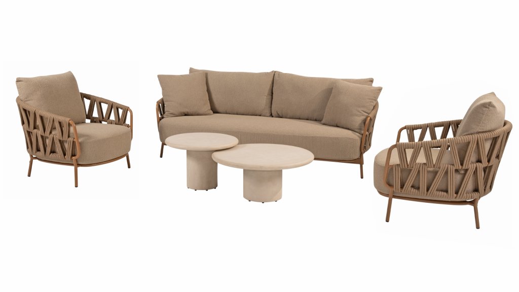 Der robuste Rahmen besteht aus pulverbeschichtetem Aluminium in einem warmen Erdton, kombiniert mit einem auffallend dicken Seilgeflecht. Diese handwerkliche Verarbeitung verleiht der Biarritz -Serie ein robustes und zugleich edles Aussehen. Die geräumigen Sitzflächen, die prallen Kissen und die weichen Texturen machen diese Lounge zu einem luxuriösen Ort für lange Sommertage.