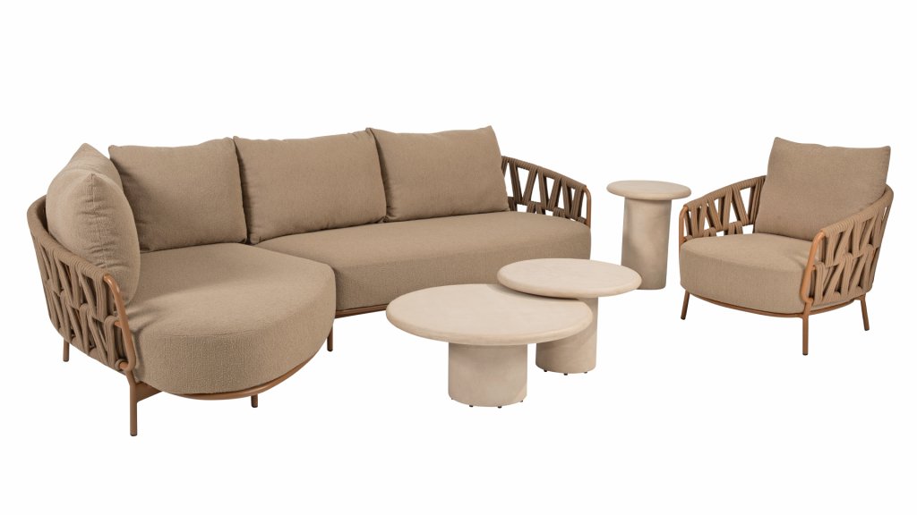 Der robuste Rahmen besteht aus pulverbeschichtetem Aluminium in einem warmen Erdton, kombiniert mit einem auffallend dicken Seilgeflecht. Diese handwerkliche Verarbeitung verleiht der Biarritz -Serie ein robustes und zugleich edles Aussehen. Die geräumigen Sitzflächen, die prallen Kissen und die weichen Texturen machen diese Lounge zu einem luxuriösen Ort für lange Sommertage.