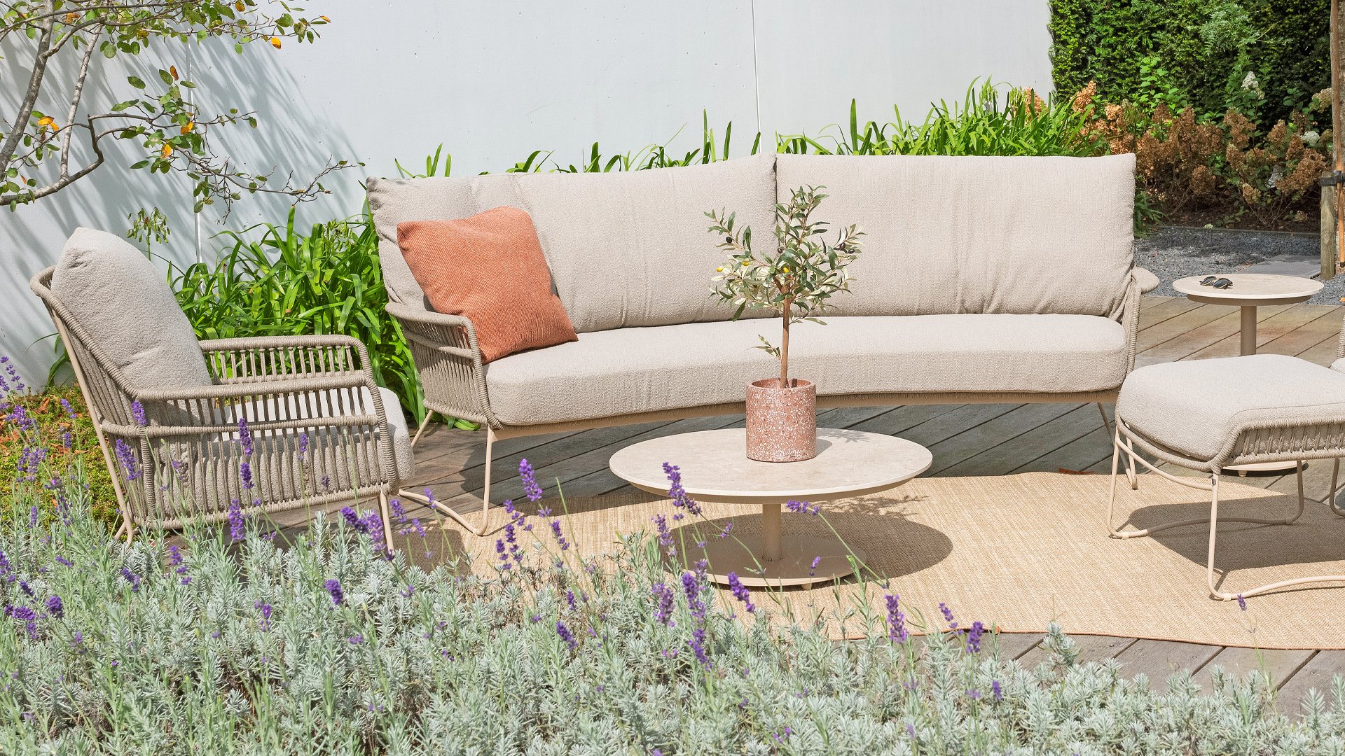 Das Botanic Lounge-Set besteht aus hochwertigen Outdoor-Materialien, die allen Wetterbedingungen standhalten. Das strapazierfähige Ropegeflecht und die weichen, aber robusten Kissenbezüge von Bouclé sorgen dafür, dass das Set nicht nur schön aussieht, sondern auch einem unerwarteten sommerlichen Regenschauer standhält. Darüber hinaus lässt sich dieses pflegeleichte 4SO Botanic Lounge-Set leicht sauber halten, sodass Sie mehr Zeit zum Entspannen und Genießen der Natur haben.