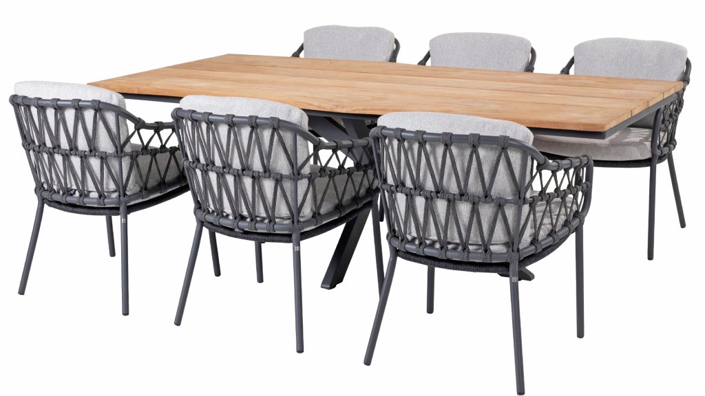 Das Calpi Dining von 4 Seasons Outdoor hat ein zeitgemäßes Design und verleiht jeder Terrasse den hochwertigen Look, den Sie suchen. Die breiten Seilpartien sind auf originelle Weise gewebt und verleihen dem Calpi einen offenen Charakter. Der Calpi wird mit einem Sitz- und Rückenkissen aus wetterfestem Stoff geliefert. Dieser Stoff wirkt wasser- und schmutzabweisend und ist somit widerstandsfähig gegen viele Witterungseinflüsse.