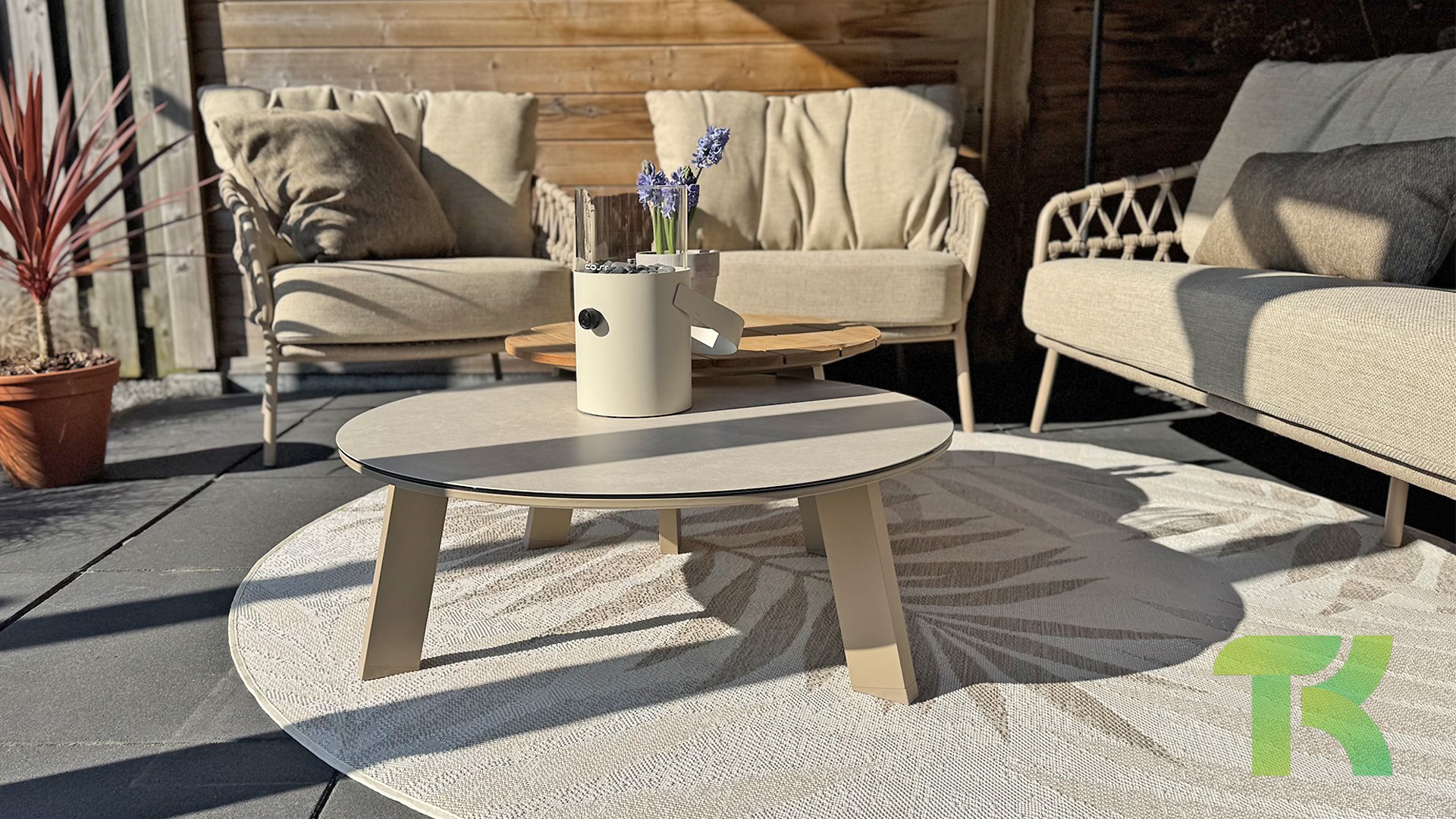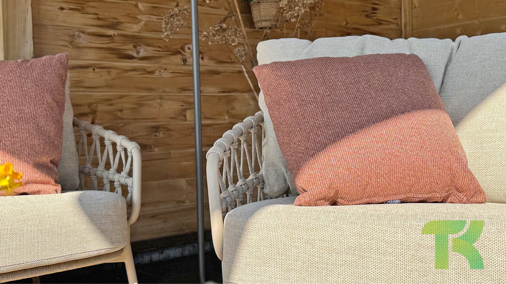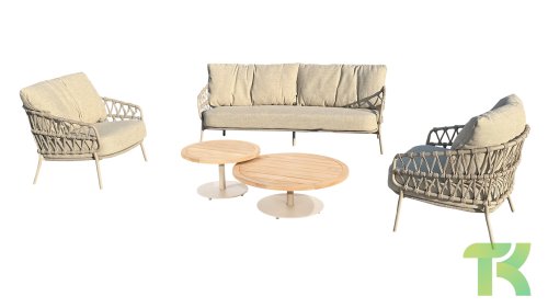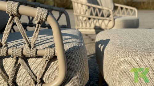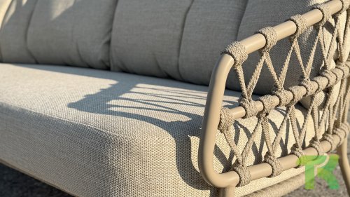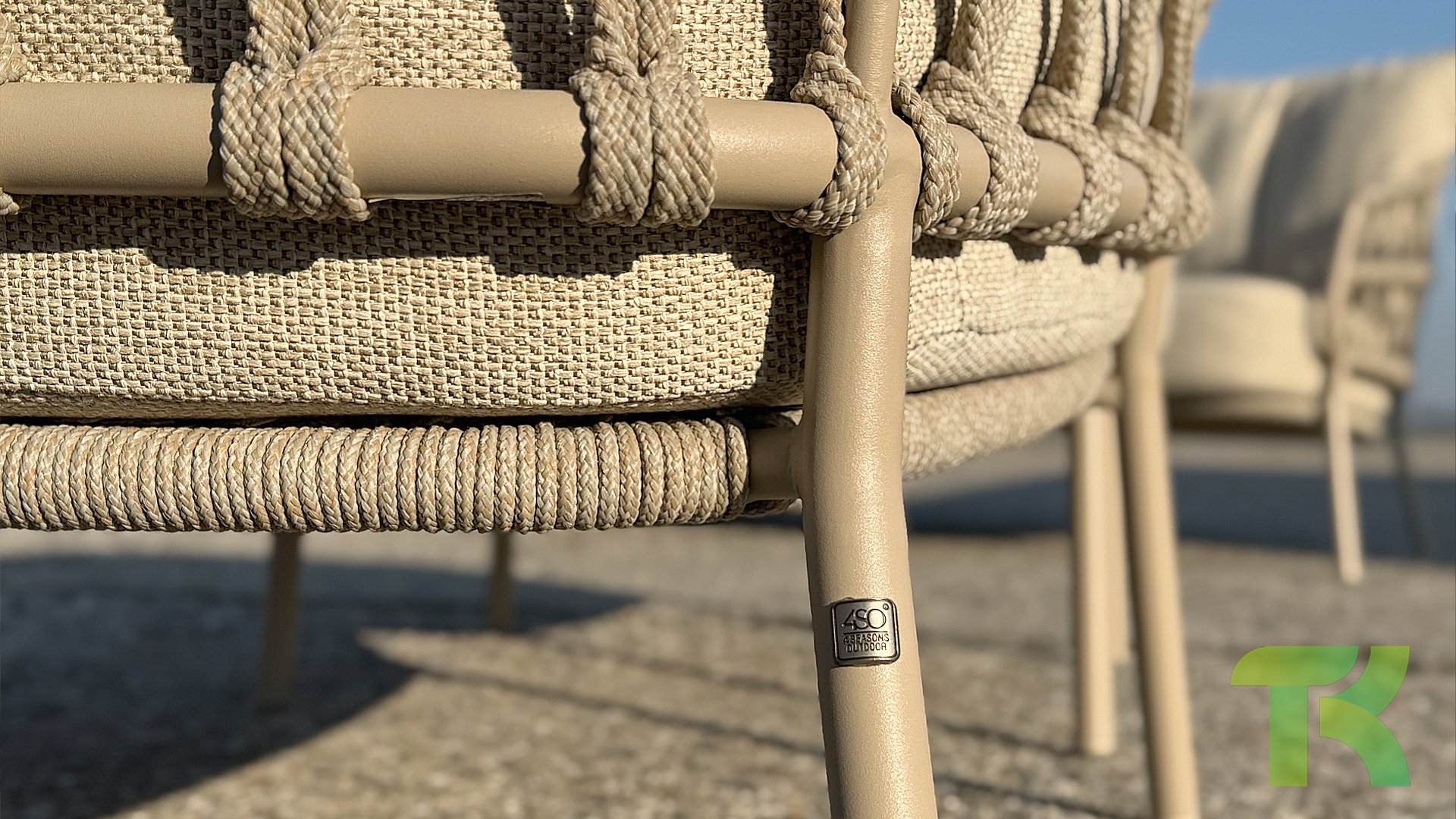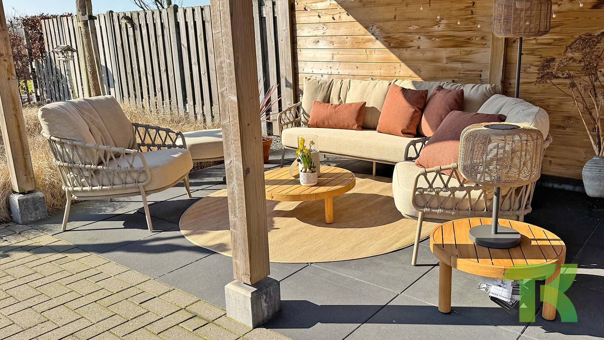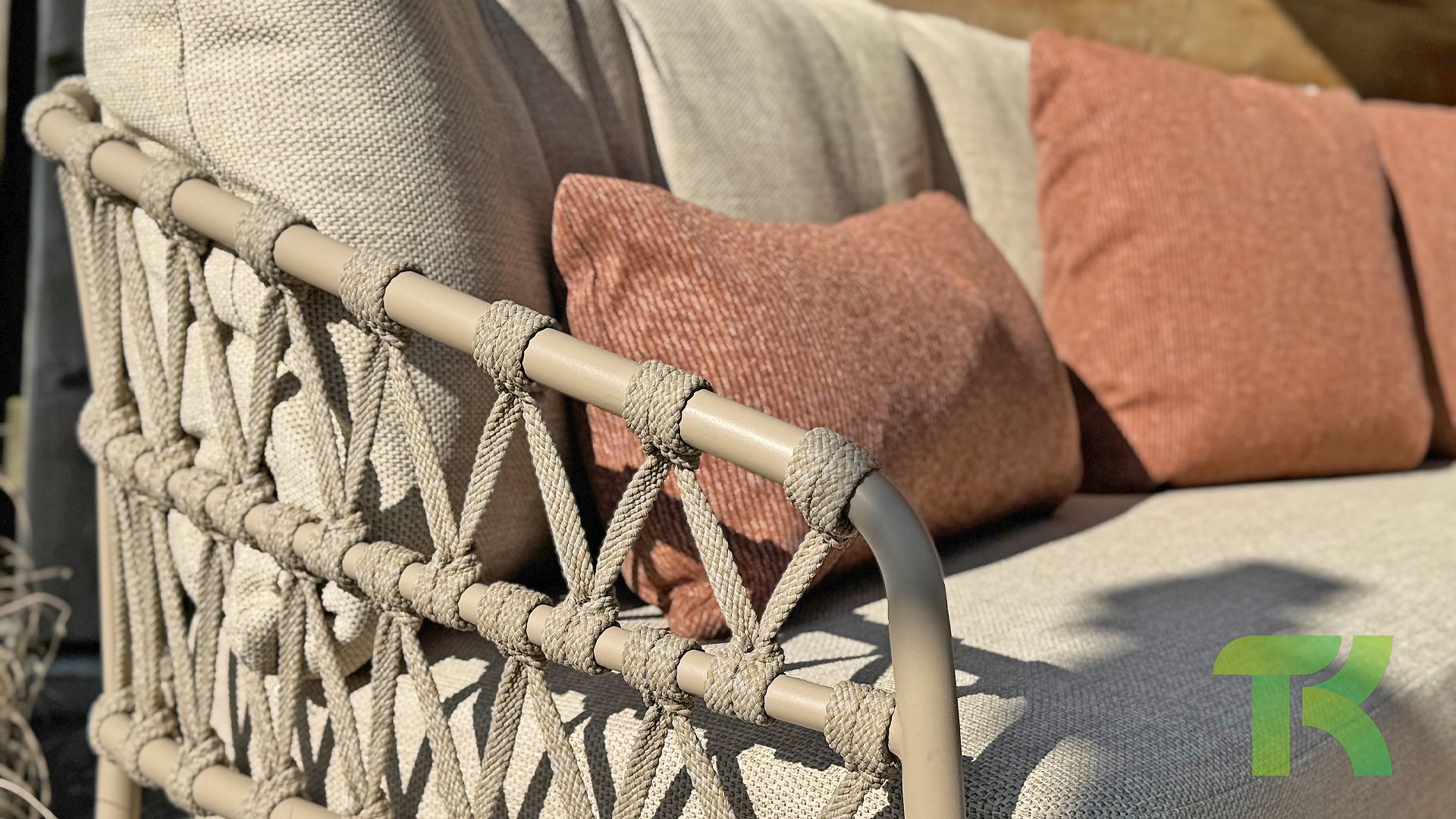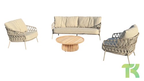 Die 4 Seasons Outdoor Calpi-Serie im neuen Gewand, Latte. Nur bei Gartenmöbel-Rabatt erhältlich! Es verfügt über ein modernes Design und verleiht jeder Terrasse das hochwertige und warme Aussehen, das Sie suchen. Die breiten Seilteile sind auf originelle Weise geflochten und verleihen dem Calpi einen offenen Charakter. Der 4Seasons Calpi wird mit Kissen aus Allwetterstoff geliefert. Dieser Stoff wirkt wasser- und schmutzabweisend und ist somit resistent gegen viele Witterungseinflüsse.