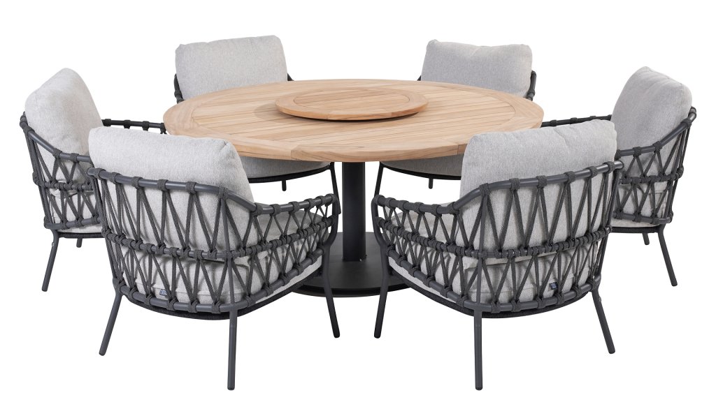 Der niedrige Esstisch 4Seasons Saba hat einen pulverbeschichteten Edelstahlfuß mit einer Tischplatte aus Teakholz. Wir empfehlen die Pflege des Teakholzes mit unseren Pflegeprodukten von 4 Seasons Outdoor, um eine lange Lebensdauer und ein schönes Aussehen zu garantieren. Der Calpi-Stuhl besteht aus einer Edelstahlbasis mit Seilteilen, die gegen verschiedene Witterungseinflüsse beständig sind.