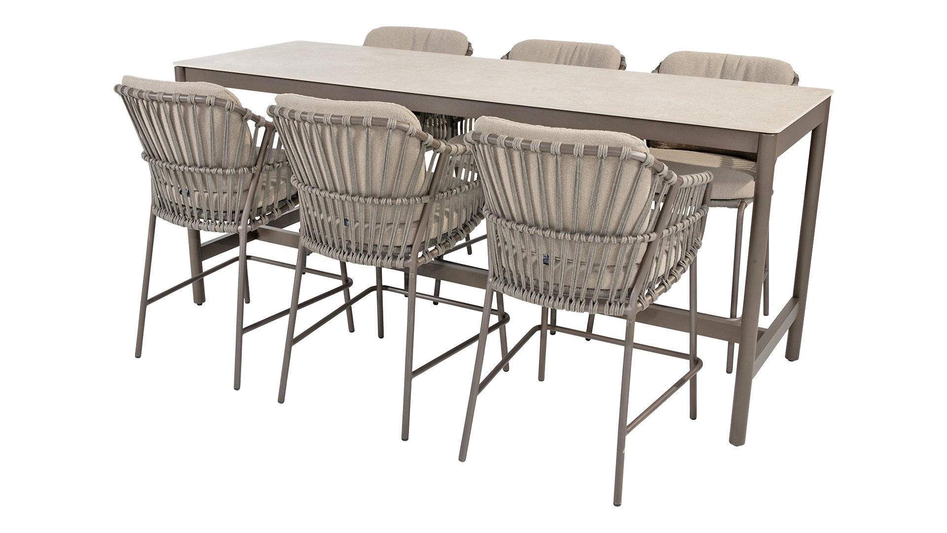 Was diesen Stuhl wirklich einzigartig macht, ist die Kombination aus taupefarbenen Kissen und einem terrefarbenen Gestell, die ihm einen warmen und eleganten Look verleiht, der zu verschiedenen Außenumgebungen passt. Die Kissen sind mit Bouclé gepolstert, einem luxuriösen Stoff, der sich weich und angenehm anfühlt und gleichzeitig Olefin enthält – ein Material, das sehr resistent gegen Verfärbungen durch Sonnenlicht und wetterbeständig ist. Das macht den 4Seasons Capalbio Counter Chair nicht nur schön, sondern auch praktisch und pflegeleicht. Das Capalbio bietet einige Optionen, die folgenden Varianten sind in dieser Serie erhältlich: Loungegruppe, Esstisch set, Low-dining set und Counterset.
