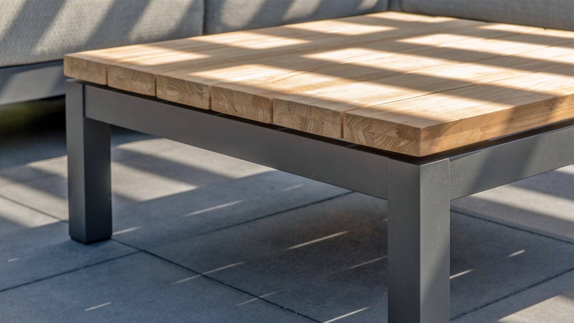 Der Capitol Couchtisch von 4Seasons verfügt über einen robusten pulverbeschichteten Aluminiumrahmen in Anthrazit, kombiniert mit einer robusten Teakholzplatte. Das Teakholz kann mit unseren 4SO-Pflegemitteln gepflegt werden.