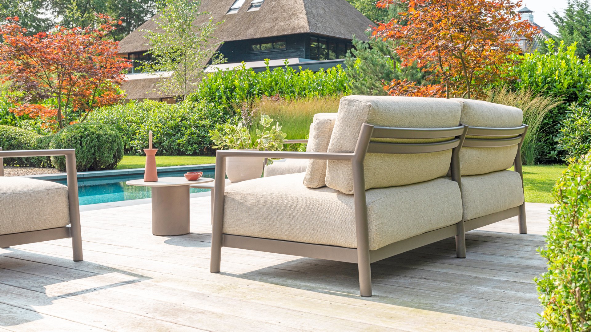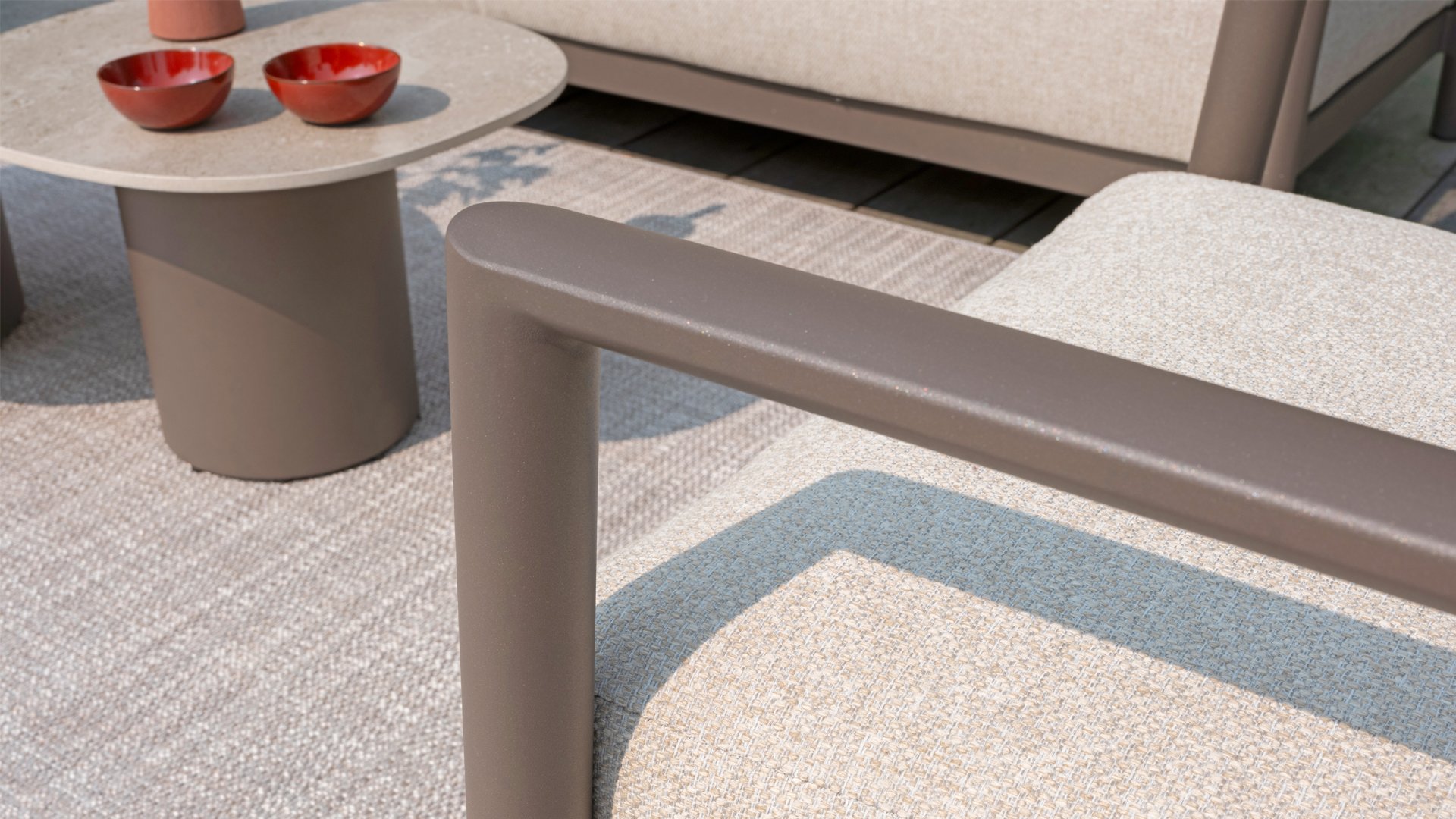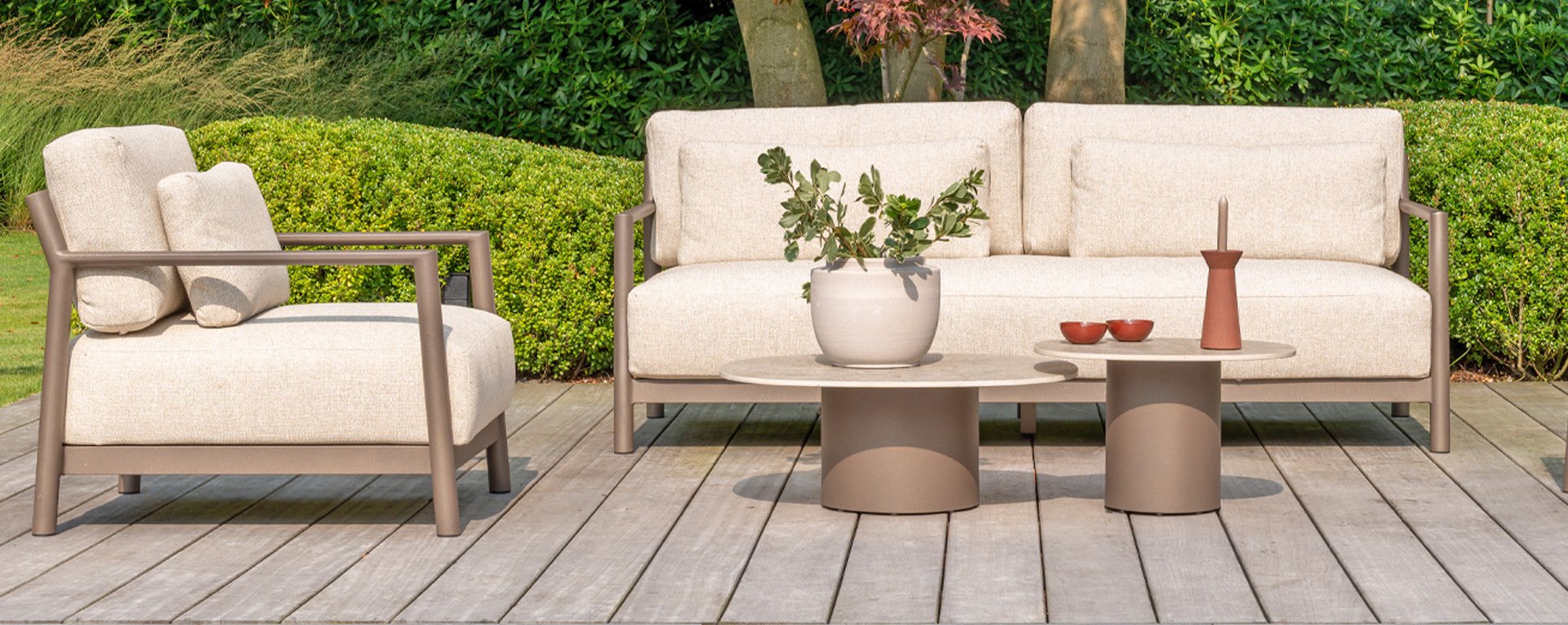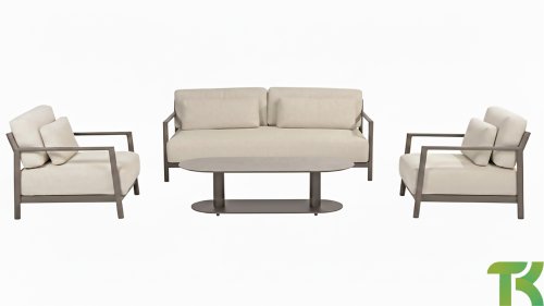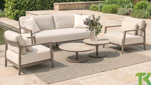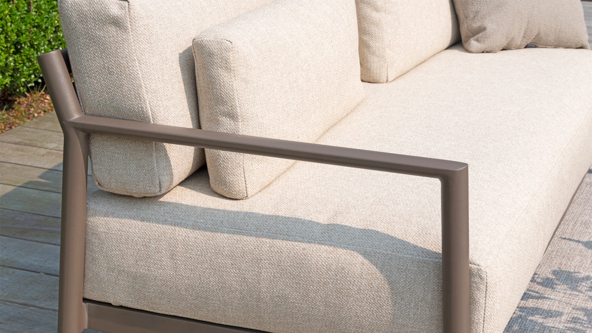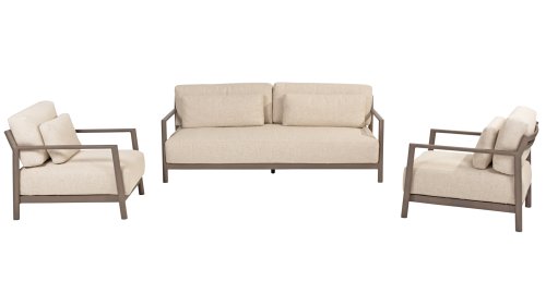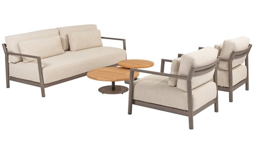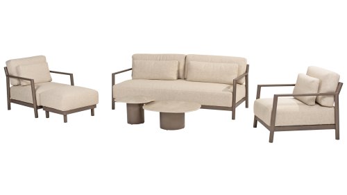 Klasse auf das Wesentliche reduziert. Lassen Sie sich vom zurückhaltenden Design von Capresi überraschen, bei dem wir die Details sprechen lassen. Der vollständig aus Aluminium gefertigte Rahmen in der Farbe Terre zeigt sublime Kurven, und die dicken Loungekissen sorgen für Kontrast und Komfort. Stellen Sie Ihre ideale Kombination zusammen und kombinieren Sie ein Sofa und/oder Stühle mit dem schönsten Couchtisch. Erleben Sie ultimativen Komfort und stilvolle Schlichtheit mit der Capresi-Loungesets von 4 Seasons Outdoor. Dieses schöne Lounge-Set in der eleganten Terre-Farbe hat ein schlichtes Design, das perfekt zu modernen Gärten passt. Der vollständig aus Aluminium gefertigte Rahmen ist mit erhabenen Kurven gestaltet, während die dicken Lounge-Kissen für einen wunderbaren Kontrast und optimalen Komfort sorgen.