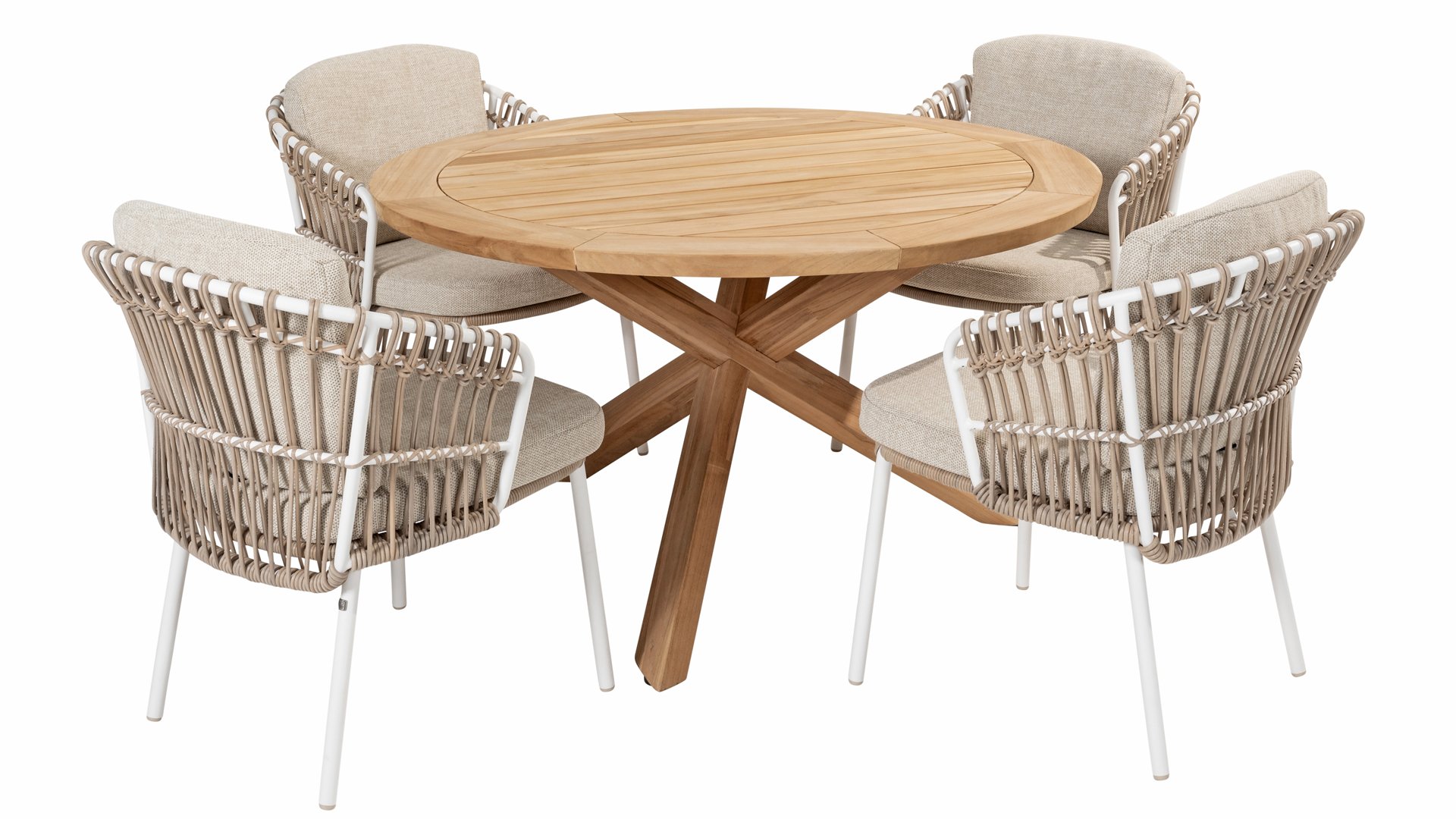 Weiße Dalias am Strand. Schließen Sie die Augen und stellen Sie sich vor, Sie wären auf Ibiza. Die sommerliche Atmosphäre, die die 4 Seasons Outdoor Dalias Gartenmöbelset Serie durch das weiße Gestell und das taupefarbene Korbgeflecht versprüht, verleiht Ihrem Garten sofort einen sonnigen Kick. Wenn Sie den Sommer mögen, werden Sie Dalias lieben.