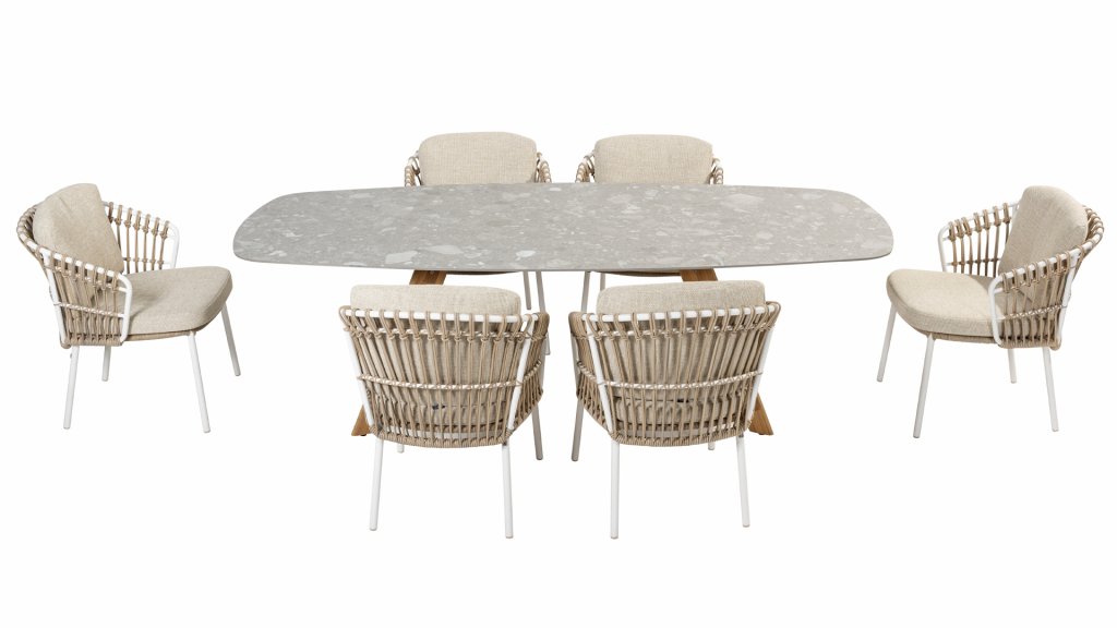 Der 4Seasons Outdoor Montana ist ein wunderschöner Tisch, der sofort ins Auge fällt. Es sieht nicht nur modern aus, sondern ist durch die Form der Tischplatte auch äußerst praktisch. Der Tisch zeichnet sich durch seine dänisch-ovale Tischplatte aus, die Form schafft ausreichend Platz auf allen Seiten des Tisches. Bei der Montana-Serie gibt es mehrere Optionen; Die 240 cm hohe Terrazzo-Keramikplatte kann mit einem Untergestell aus Edelstahl oder Teakholz kombiniert werden. Innerhalb der Montana-Serie gibt es auch einen 280 cm großen Tisch mit HPL-Platte.