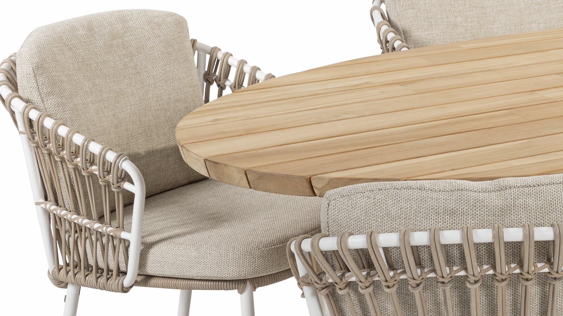 Weiße Dahlien am Strand Schließe die Augen und fühle dich wie in Ibiza. Die sommerliche Atmosphäre, die die 4 Seasons Outdoor Dalias Dining Serie durch den weißen Rahmen und das taupefarbene Flechtwerk verströmt, gibt deinem Garten sofort einen sonnigen Schub. Wenn du den Sommer liebst, wirst du Dalias lieben.