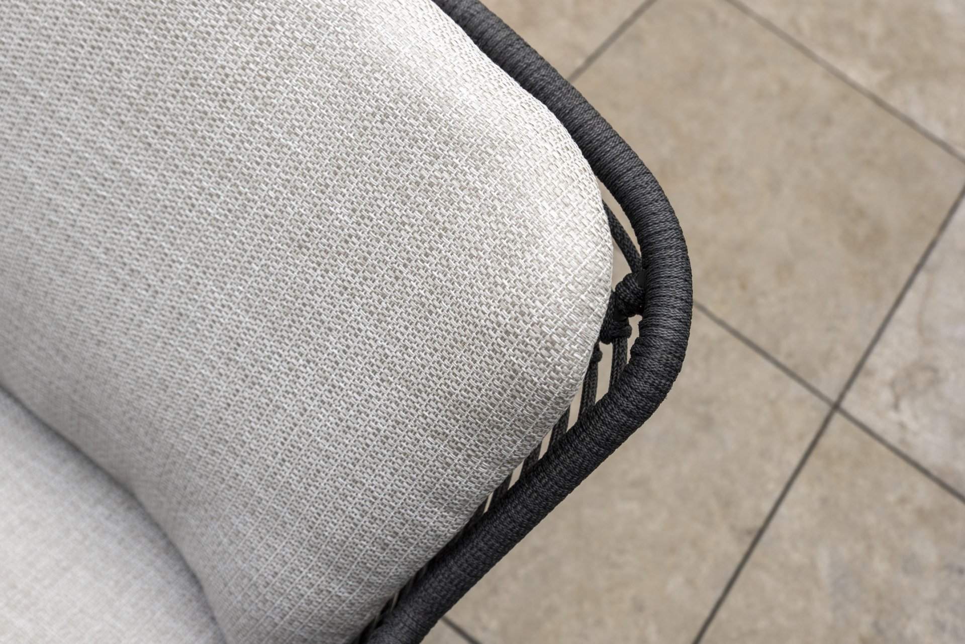 Aus den besten Materialien gefertigt, mit Leidenschaft hergestellt. Diese wunderschöne 4Seasons Fabrice Dining-Serie besticht nicht nur durch Stil, sondern auch durch hervorragenden Sitzkomfort. Der Stuhl ist auch in folgenden Farben erhältlich: Anthrazit, Latte & TerreDie verwendeten Materialien sind Kunststoffseil, Olefin & Aluminium. Kunststoffseil enthält einen Kern, der für Farbechtheit sorgt und es schimmelbeständig macht. Olefin macht die Kissen ebenfalls farbecht und wasserbeständig, der Stoff fühlt sich auch angenehm an. Das Gestell des Fabrice ist pulverbeschichtetes Aluminium, um das moderne Design abzurunden! Auch erhältlich in Lounge: 4SO Fabrice Eck-Loungeset & 4SO Fabrice Loungeset.