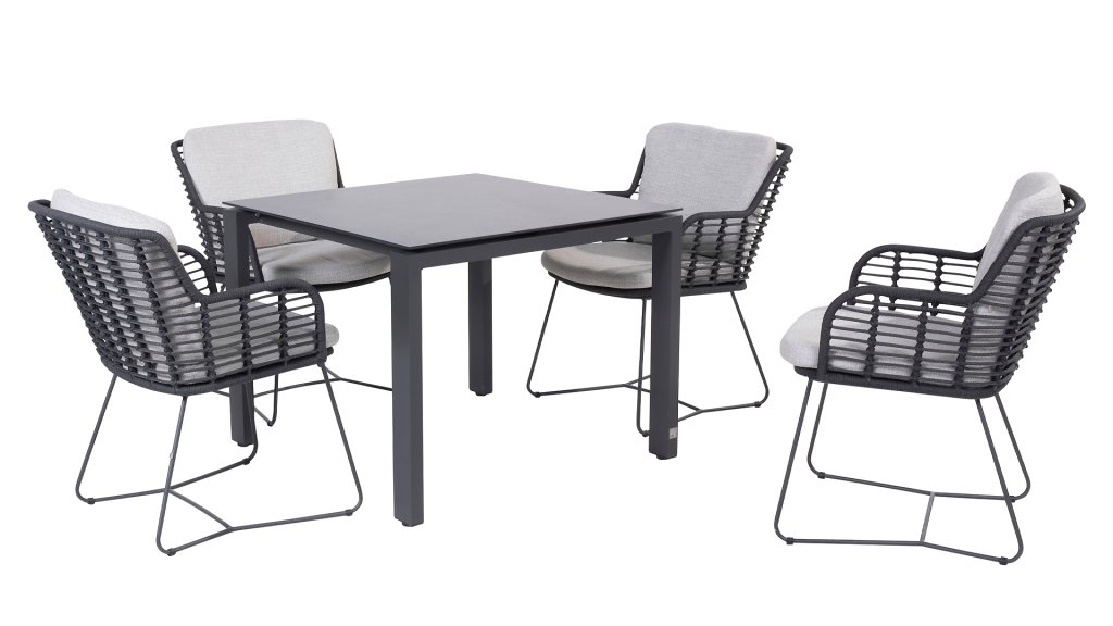 Aus den besten Materialien gefertigt, mit Leidenschaft hergestellt. Diese wunderschöne 4Seasons Fabrice Dining-Serie besticht nicht nur durch Stil, sondern auch durch hervorragenden Sitzkomfort. Der Stuhl ist auch in folgenden Farben erhältlich: Anthrazit, Latte & Terre. Die verwendeten Materialien sind Kunststoffseil, Olefin & Aluminium. Kunststoffseil enthält einen Kern, der für Farbechtheit sorgt und es schimmelbeständig macht. Olefin macht die Kissen ebenfalls farbecht und wasserbeständig, der Stoff fühlt sich auch angenehm an. Das Gestell des Fabrice ist pulverbeschichtetes Aluminium, um das moderne Design abzurunden! Auch erhältlich in Lounge: 4SO Fabrice Eck-Loungeset & 4SO Fabrice Loungeset.
