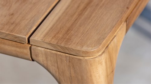 Der Liam-Tisch von Taste 4SO hat ein elegantes Design, das bei der Platzierung im Raum deutlich sichtbar ist. Die Tischplatte fällt dadurch auf, dass die Lamellen über die gesamte Breite reichen. Diese Tischplatte unterscheidet sich von den meisten anderen Tischen und sorgt für ein modernes und originelles Aussehen. Der Liam-Tisch hat ein schönes, elegantes Untergestell, das wunderbar zur Tischplatte passt. Der Tisch besteht vollständig aus Teakholz, kann das ganze Jahr über draußen stehen bleiben.