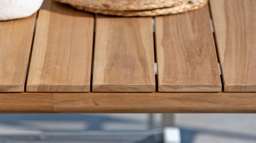 Gartenmöbel aus Teakholz bieten einen atemberaubenden Blick.Teakholz eignet sich besonders gut für den Einsatz im Außenbereich. Es ist resistent gegen Schädlinge und Pilze und widerstandsfähig gegen Sonne, Regen und Schnee. Mit der Zeit entwickelt das Teakholz eine silbergraue Patina. Gartenmöbel aus Teakholz bieten einen atemberaubenden Blick. Darüber hinaus ist es starkes Material und erfordert nur wenig Wartung. Wer die ursprüngliche Farbe des Teakholzes bevorzugt, kann durch regelmäßiges benutzen unser Pflegemittel ganz einfach das Vergrauen des Holzes verhindern.Darüber hinaus können Sie Teak mit grüner Seife reinigen. Durch Temperaturunterschiede und durch den Wechsel von Feuchtigkeit und Trockenheit können kleine Haarrisse entstehen. Es ist üblich, dass Man in dies Unvollkommenheiten findet, diese Unregelmäßigkeiten sind kennzeichnend für dieses Produkt. Diese Unregelmäßigkeiten können nie einen Anlass zu Reklamation, Garantie oder Claim formen. Es betrifft eine Unterschrift von Originalität!  Wir gewähren Garantie auf alle Produktions- und Konstruktionsfehler. Die Wirkung von Teakholz ist nicht enthalten. Wenn Sie sich für Teakholz entscheiden, erwarten wir, dass Sie diese Eigenschaften zu schätzen wissen. Eventuell auftretende Haarrisse, Äste im Teakholz und raue Oberflächen im Laufe der Zeit fallen nicht unter unsere Garantie. Diese Eigenschaften verleihen dem Teakholz seinen eigenen Charakter und sind Teil der Optik. Seien Sie vorsichtig mit einem Blumentopf oder einer Vase auf Ihrem Gartentisch aus Teakholz, da dies zu hartnäckigen Kreisen oder Farbunterschieden führen kann.