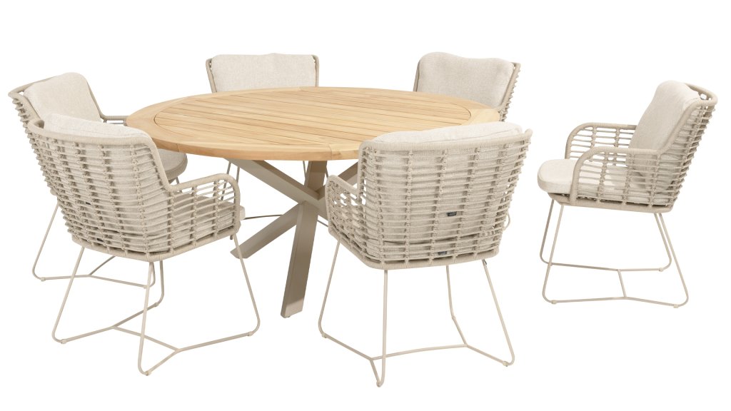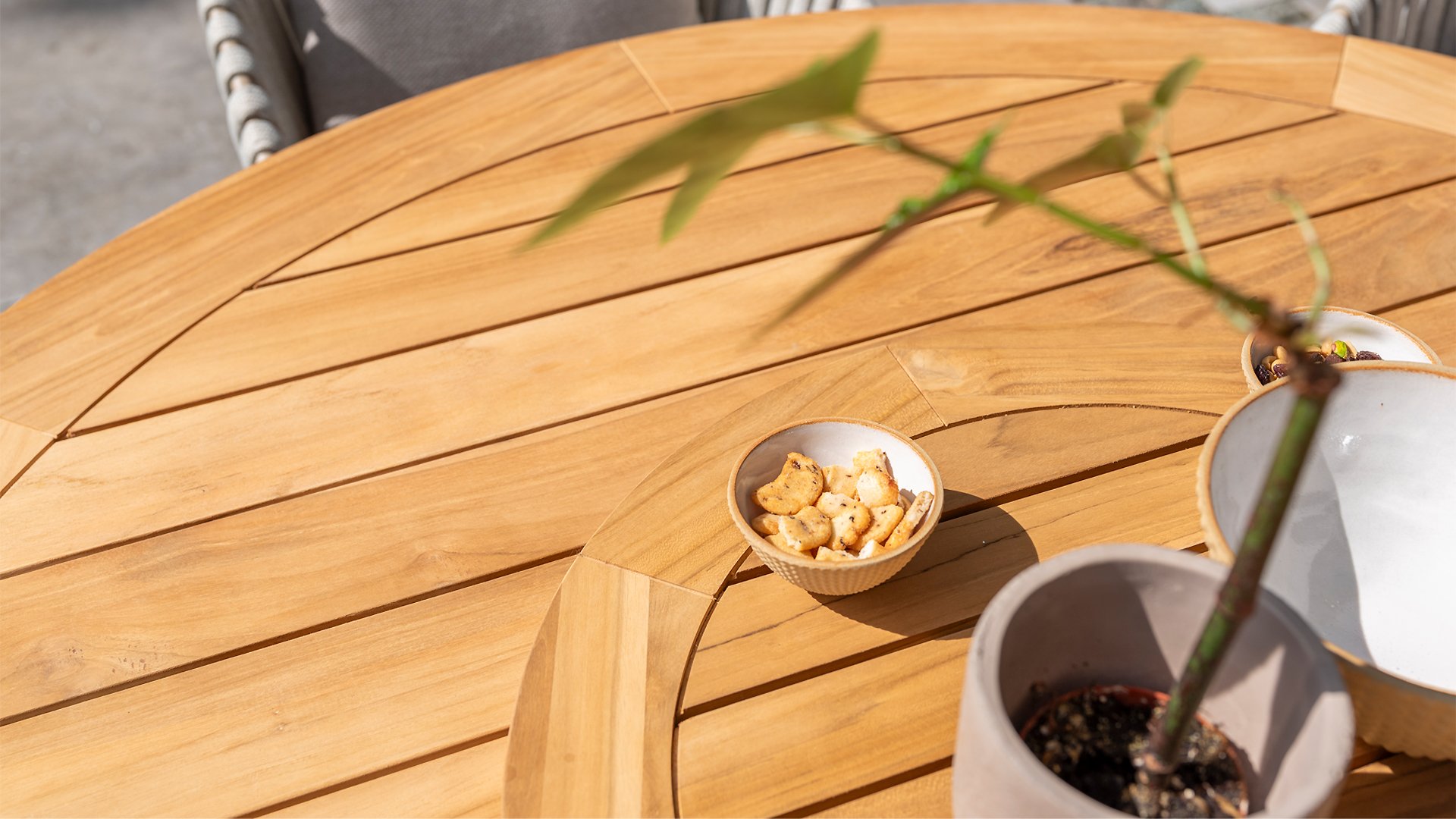 Gartenmöbel aus Teakholz bieten einen atemberaubenden Blick.Teakholz eignet sich besonders gut für den Einsatz im Außenbereich. Es ist resistent gegen Schädlinge und Pilze und widerstandsfähig gegen Sonne, Regen und Schnee. Mit der Zeit entwickelt das Teakholz eine silbergraue Patina. Gartenmöbel aus Teakholz bieten einen atemberaubenden Blick. Darüber hinaus ist es starkes Material und erfordert nur wenig Wartung. Wer die ursprüngliche Farbe des Teakholzes bevorzugt, kann durch regelmäßiges benutzen unser Pflegemittel ganz einfach das Vergrauen des Holzes verhindern.Darüber hinaus können Sie Teak mit grüner Seife reinigen. Durch Temperaturunterschiede und durch den Wechsel von Feuchtigkeit und Trockenheit können kleine Haarrisse entstehen. Es ist üblich, dass Man in dies Unvollkommenheiten findet, diese Unregelmäßigkeiten sind kennzeichnend für dieses Produkt. Diese Unregelmäßigkeiten können nie einen Anlass zu Reklamation, Garantie oder Claim formen. Es betrifft eine Unterschrift von Originalität!  Wir gewähren Garantie auf alle Produktions- und Konstruktionsfehler. Die Wirkung von Teakholz ist nicht enthalten. Wenn Sie sich für Teakholz entscheiden, erwarten wir, dass Sie diese Eigenschaften zu schätzen wissen. Eventuell auftretende Haarrisse, Äste im Teakholz und raue Oberflächen im Laufe der Zeit fallen nicht unter unsere Garantie. Diese Eigenschaften verleihen dem Teakholz seinen eigenen Charakter und sind Teil der Optik. Seien Sie vorsichtig mit einem Blumentopf oder einer Vase auf Ihrem Gartentisch aus Teakholz, da dies zu hartnäckigen Kreisen oder Farbunterschieden führen kann.
