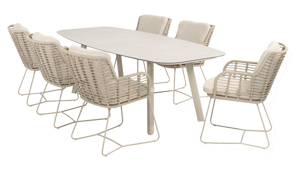 Aus den besten Materialien gefertigt, mit Leidenschaft hergestellt. Diese wunderschöne 4Seasons Fabrice Dining-Serie besticht nicht nur durch Stil, sondern auch durch hervorragenden Sitzkomfort. Der Stuhl ist auch in folgenden Farben erhältlich: Anthrazit, Latte & TerreDie verwendeten Materialien sind Kunststoffseil, Olefin & Aluminium. Kunststoffseil enthält einen Kern, der für Farbechtheit sorgt und es schimmelbeständig macht. Olefin macht die Kissen ebenfalls farbecht und wasserbeständig, der Stoff fühlt sich auch angenehm an. Das Gestell des Fabrice ist pulverbeschichtetes Aluminium, um das moderne Design abzurunden! Auch erhältlich in Lounge: 4SO Fabrice Eck-Loungeset & 4SO Fabrice Loungeset.