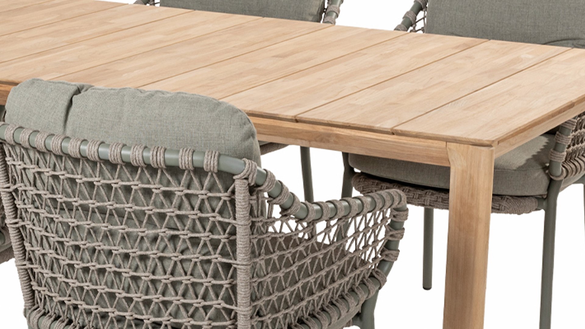 Gartenmöbel aus Teakholz bieten einen atemberaubenden Blick.Teakholz eignet sich besonders gut für den Einsatz im Außenbereich. Es ist resistent gegen Schädlinge und Pilze und widerstandsfähig gegen Sonne, Regen und Schnee. Mit der Zeit entwickelt das Teakholz eine silbergraue Patina. Gartenmöbel aus Teakholz bieten einen atemberaubenden Blick. Darüber hinaus ist es starkes Material und erfordert nur wenig Wartung. Wer die ursprüngliche Farbe des Teakholzes bevorzugt, kann durch regelmäßiges benutzen unser Pflegemittel ganz einfach das Vergrauen des Holzes verhindern.Darüber hinaus können Sie Teak mit grüner Seife reinigen. Durch Temperaturunterschiede und durch den Wechsel von Feuchtigkeit und Trockenheit können kleine Haarrisse entstehen. Es ist üblich, dass Man in dies Unvollkommenheiten findet, diese Unregelmäßigkeiten sind kennzeichnend für dieses Produkt. Diese Unregelmäßigkeiten können nie einen Anlass zu Reklamation, Garantie oder Claim formen. Es betrifft eine Unterschrift von Originalität!  Wir gewähren Garantie auf alle Produktions- und Konstruktionsfehler. Die Wirkung von Teakholz ist nicht enthalten. Wenn Sie sich für Teakholz entscheiden, erwarten wir, dass Sie diese Eigenschaften zu schätzen wissen. Eventuell auftretende Haarrisse, Äste im Teakholz und raue Oberflächen im Laufe der Zeit fallen nicht unter unsere Garantie. Diese Eigenschaften verleihen dem Teakholz seinen eigenen Charakter und sind Teil der Optik. Seien Sie vorsichtig mit einem Blumentopf oder einer Vase auf Ihrem Gartentisch aus Teakholz, da dies zu hartnäckigen Kreisen oder Farbunterschieden führen kann.