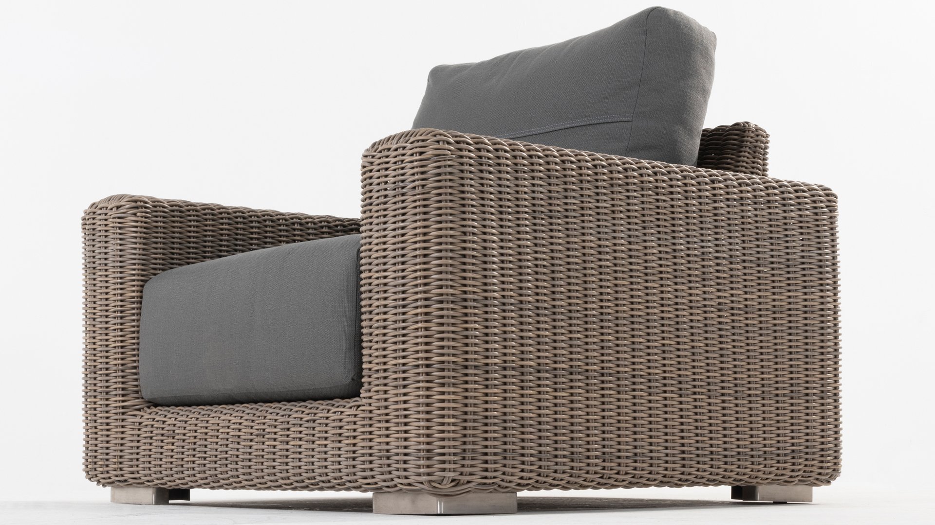 Die Module der 4So Kingston Loungesofa können alle miteinander verbunden werden. Der Aluminiumrahmen wird mit 5 mm runden reinen Hularo® Geflecht bespannt und hat Edelstahlbeine. Der Couchtisch hat eine Glasplatte aus Sicherheitsglas. Die grauen Olefin Kissen haben ein besonderes Detail: Die Rückenkissen können auf zwei Arten genutzt werden. Für eine etwas ruhigere Optik, zeigen die Kissen eine glatte Seite. Für eine lebendige Wirkung, zeigt die andere eine Nahtverbindung.