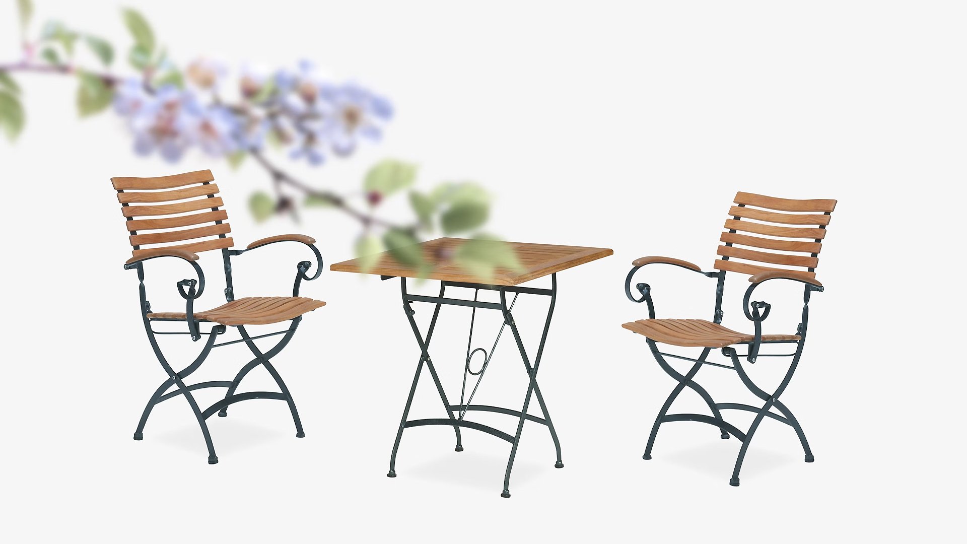 Die ergonomischen Rundungen im Holz machen die Möbel viel komfortabler als man zunächst erwarten würde. Neben den ausgezeichneten praktischen Eigenschaften ist das Set äußerst dekorativ. Ihr Garten erhält sofort eine malerische Ausstrahlung, das Verstauen der Möbel ist sehr einfach, da jedes Gartenmöbel klappbar ist und somit sehr kompakt.