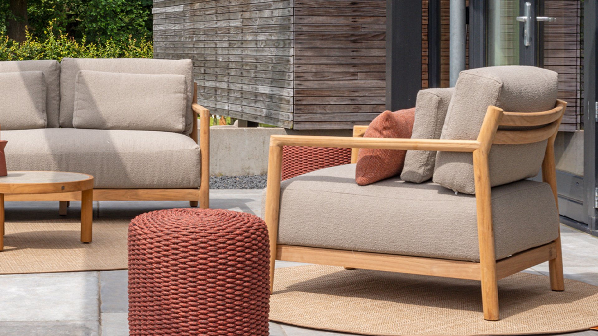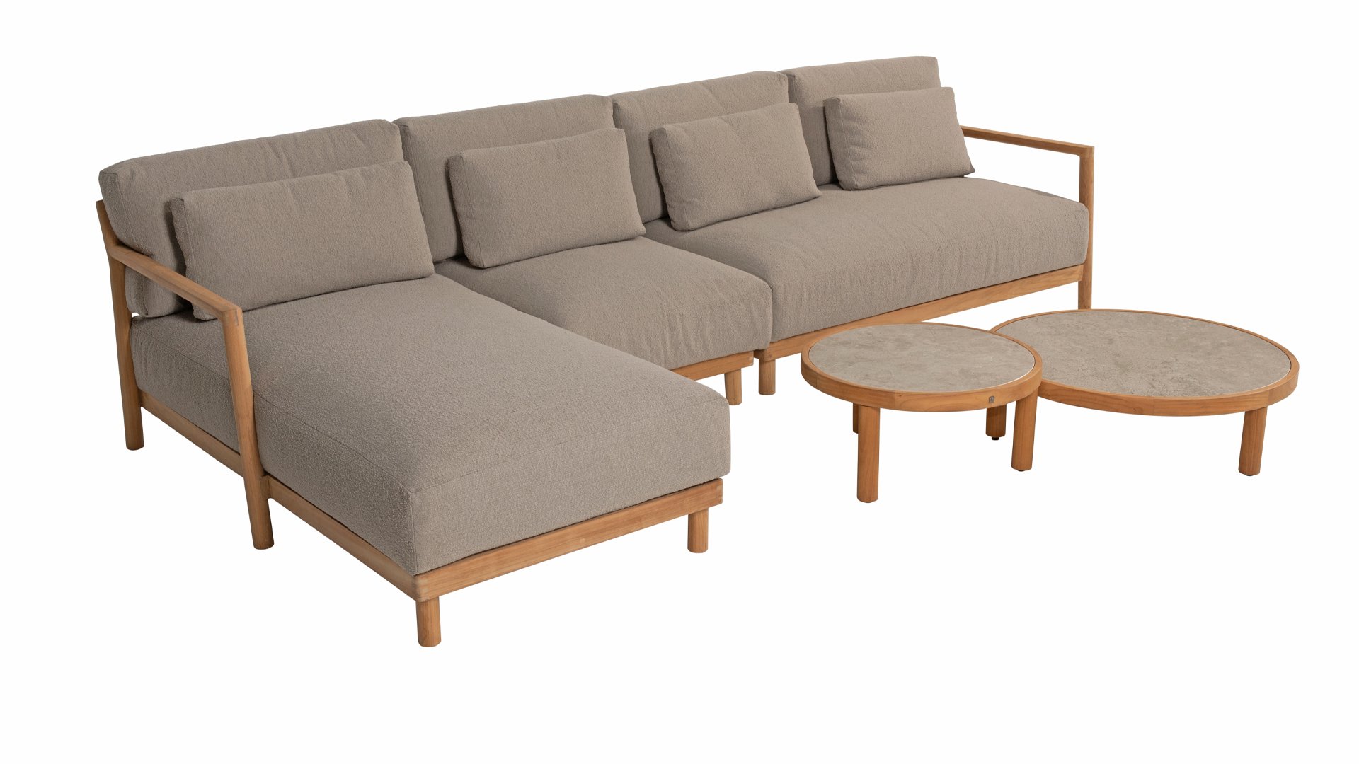 Die warmen Bouclé-Kissen sorgen für einen luxuriösen Look und optimalen Sitzkomfort, ideal für jeden Außenbereich. Ob Sie einen gemütlichen Abend mit Freunden verbringen oder einfach nur in der Sonne entspannen möchten, dieses Lounge-Set bietet den perfekten Rahmen.