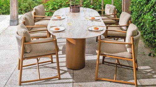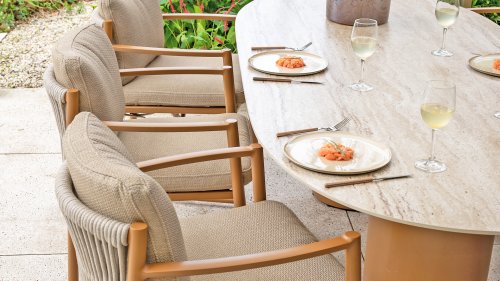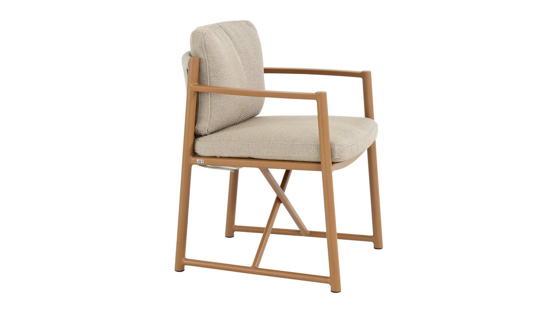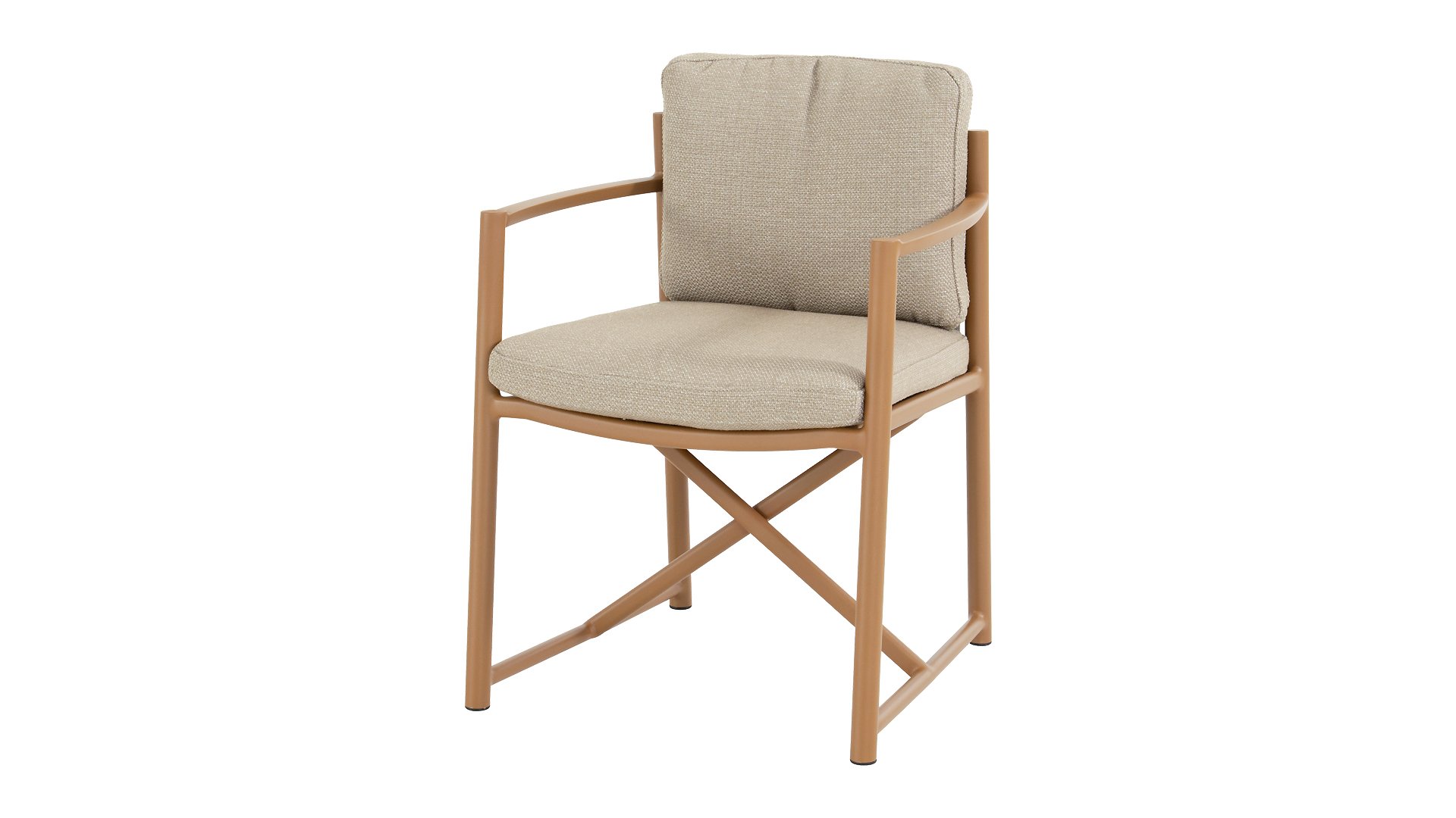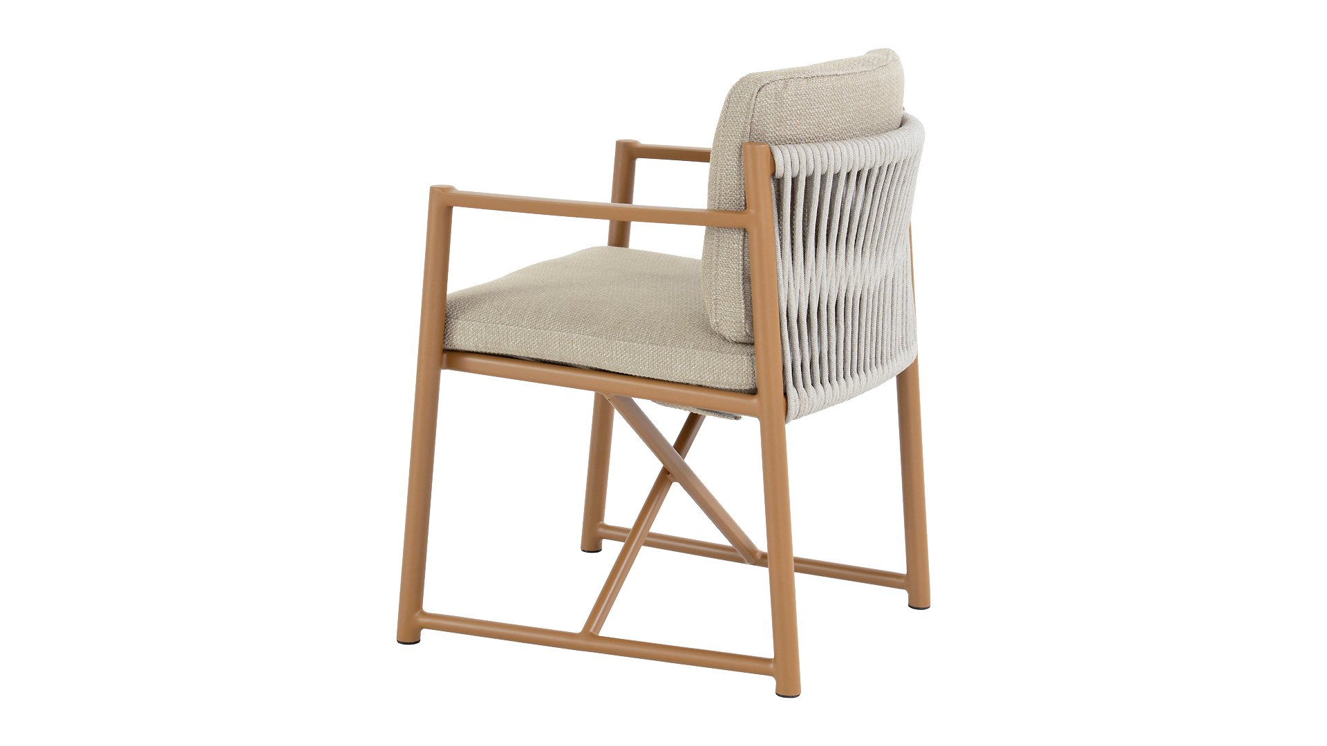 Der 4 Seasons Outdoor Marina Amber Esszimmerstuhl ist ideal für alle, die elegante, formschöne Möbel lieben. Das Gestell aus pulverbeschichtetem Aluminium in einem warmen Erdton kombiniert mit luftigen Seiten und einem Seilgeflecht an der Rückenlehne verleiht ihm einen luxuriösen Look. Die wetterfesten Olefin-Kissenbezüge sind UV- und schimmelresistent – perfekt für jahrelange Nutzung im Freien.