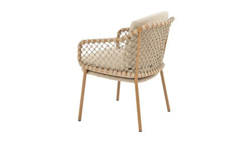 Mit einer eleganten und luftigen geflochtenen Seilstruktur in einem warmen Bernsteinton, kombiniert mit einer dezent geschwungenen Rückenlehne. Die Kombination aus offenem Seilgeflecht und natürlichen Farbtönen schafft eine moderne, einladende Atmosphäre. Die weichen sandfarbenen Kissen bieten bequemen Sitzkomfort – ideal für lange Sommerabende am Tisch.