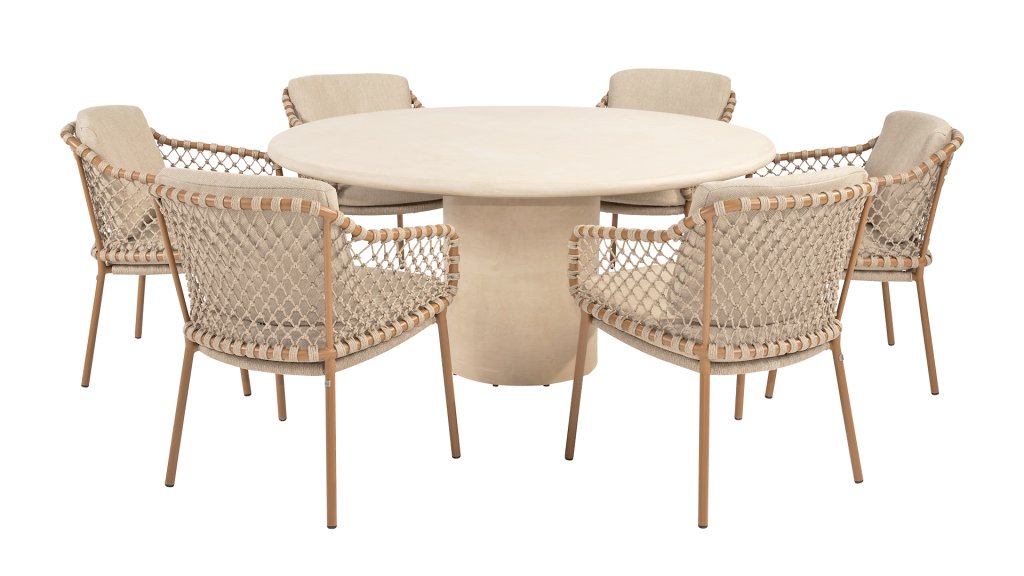 Mit einer eleganten und luftigen geflochtenen Seilstruktur in einem warmen Bernsteinton, kombiniert mit einer dezent geschwungenen Rückenlehne. Die Kombination aus offenem Seilgeflecht und natürlichen Farbtönen schafft eine moderne, einladende Atmosphäre. Die weichen sandfarbenen Kissen bieten bequemen Sitzkomfort – ideal für lange Sommerabende am Tisch.