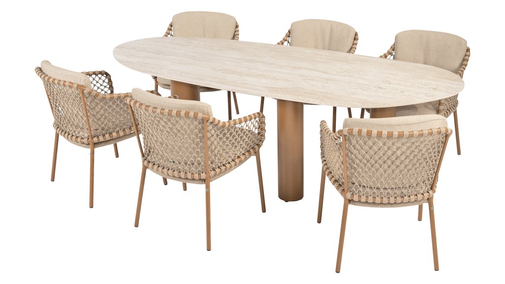 Mit einer eleganten und luftigen geflochtenen Seilstruktur in einem warmen Bernsteinton, kombiniert mit einer dezent geschwungenen Rückenlehne. Die Kombination aus offenem Seilgeflecht und natürlichen Farbtönen schafft eine moderne, einladende Atmosphäre. Die weichen sandfarbenen Kissen bieten bequemen Sitzkomfort – ideal für lange Sommerabende am Tisch.